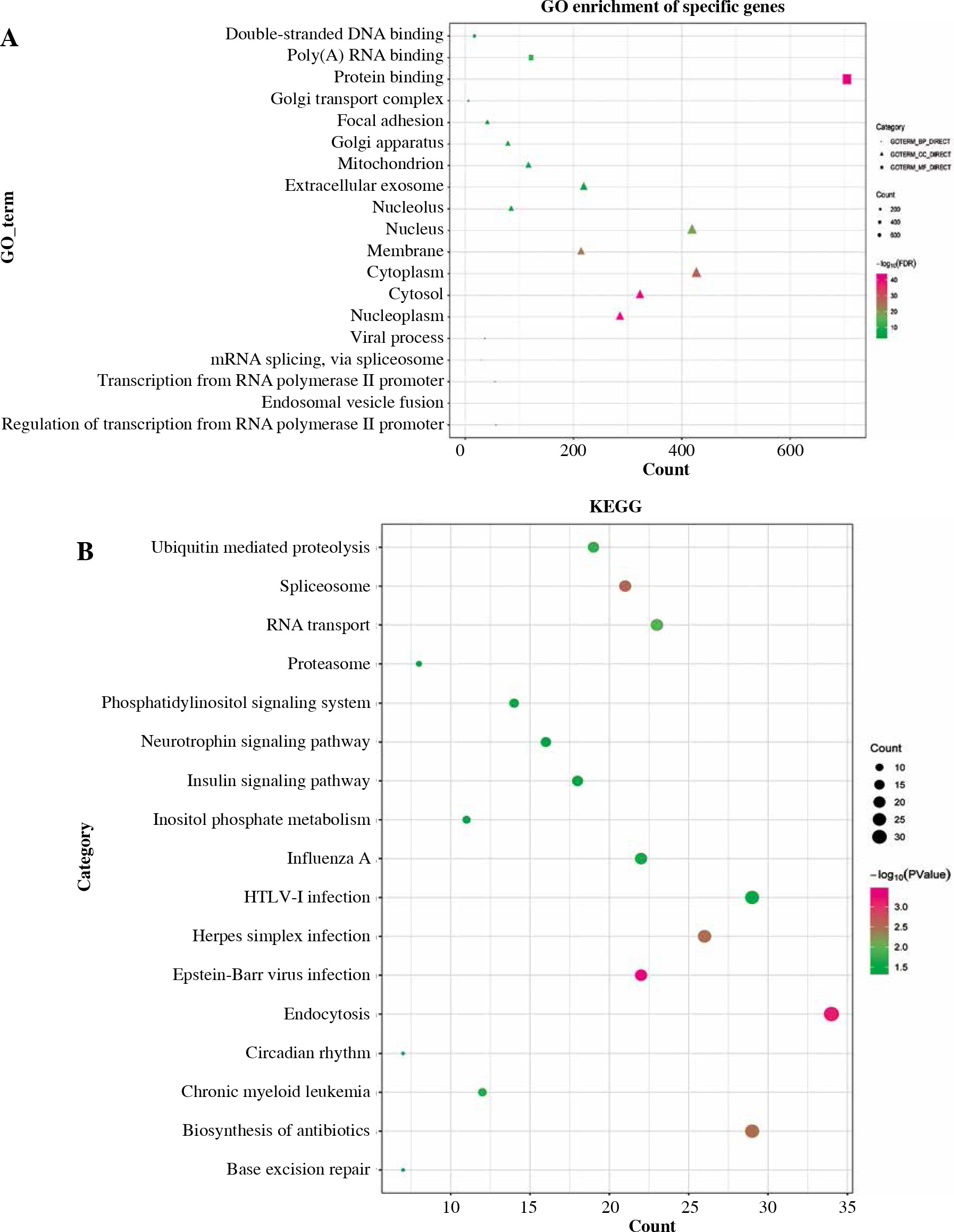Gene ontology (GO) and Kyoto Encyclopedia of Genes and Genomes (KEGG) functional enrichment analysis of DEmRNA. A) GO functional enrichment of DEmRNA. Circle, triangle and square represent biological process (BP), cellular component (CC) and molecular function (MF), respectively; B) KEGG functional enrichment of DEmRNA
