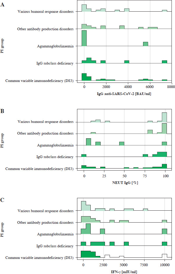 These comparisons provide a general overview of the differences in serological parameters between patient groups. The results of the serological parameter analysis indicate significant differences in the immunological response of patients to SARS-CoV-2 antigen exposure based on their immunological diagnoses. Patients with agammaglobulinaemia tended to exhibit lower levels of IgG antibodies and neutralizing IgG antibodies compared to other patients. Comparing the IFN-γ levels in patients with agammaglobulinaemia to other groups of immunodeficient patients, it was observed that the cellular response, assessed based on interferon concentration, was quite robust. Only patients with IgG subclass deficiency exhibited higher IFN levels compared to the agammaglobulinaemia group. Patients with IgG subclass deficiency tended to have higher IFN-γ levels (3502.5 mIU/ml vs. 2675.9 mIU/ml). However, it is important to note that these comparisons are based on averaged data, and individual variations within each group may exist. Other factors that could potentially influence the results include the time since exposure to SARS-CoV-2 antigen, the number of vaccine doses received, the type of vaccine administered, and prior infection. These observations suggest that specific immunological disorders may influence the immunological response of patients to COVID-19 vaccinations. Therefore, while these comparisons provide valuable insights, further analysis considering these factors is necessary to fully understand the impact on serological parameters in each patient group.
