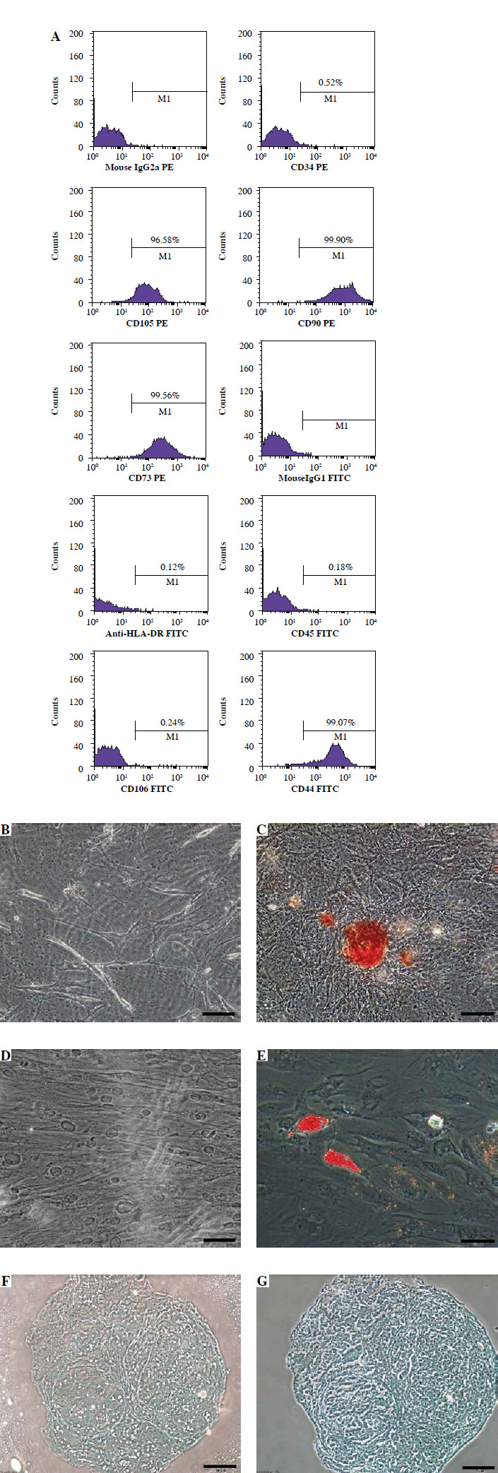 Characterization of Wharton’s jelly mesenchymal stem cells (WJ-MSCs): A) flow cytometry analysis of cells B) osteogenic differentiation control, C) osteogenic differentiated group, D) adipogenic differentiation control, E) adipogenic differentiated group, F) chondrogenic differentiation not stained, G) and chondrogenic differentiated group stained with alcian blue. Scale bar: 50 µm