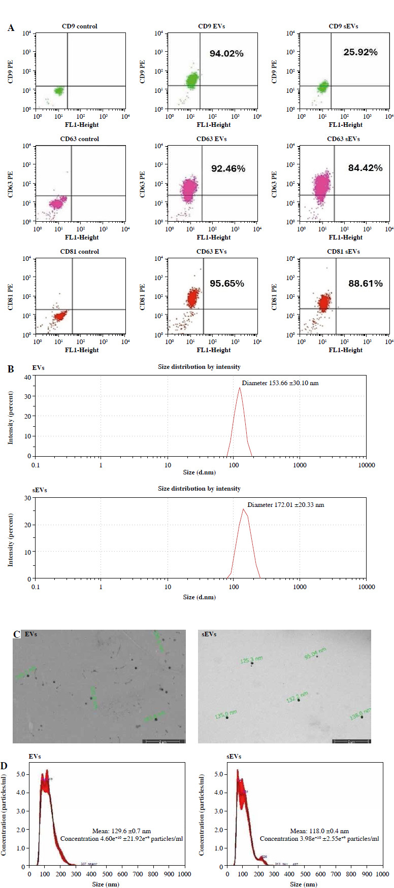 Scanning electron microscopy (SEM) imaging revealed that EVs had a round morphology. The average size of EVs was 148.66 ±31.01 nm and that of sEVs was 121.0 ±17.29 nm (Fig. 3C).