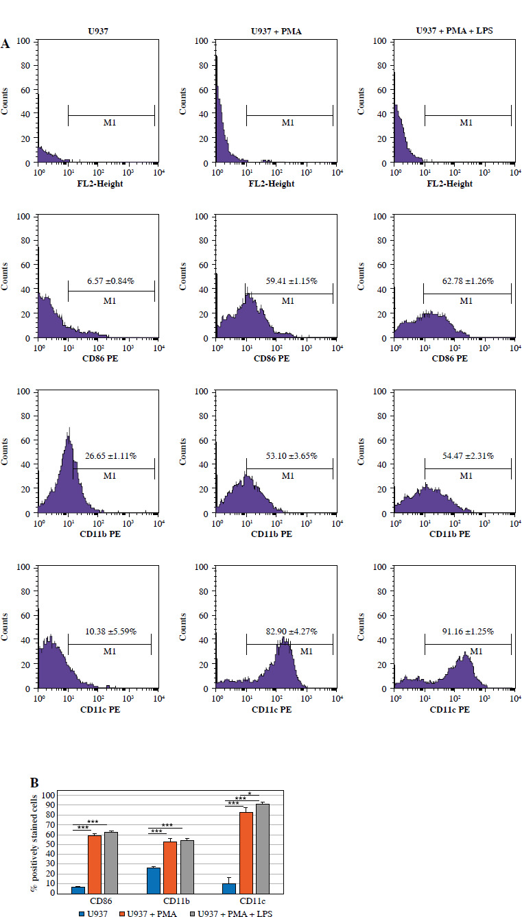 A) Confirmation of induced U937 macrophage differentiation by flow cytometry. CD86, CD11b and CD11c examination of U937 cells, U937 stimulated with PMA only and U937 cells stimulated with both PMA and LPS B) The data represent the mean ± SEM of % positively stained cells (n = 3). * indicates statistical significance level (*p < 0.05, ***p < 0.001)