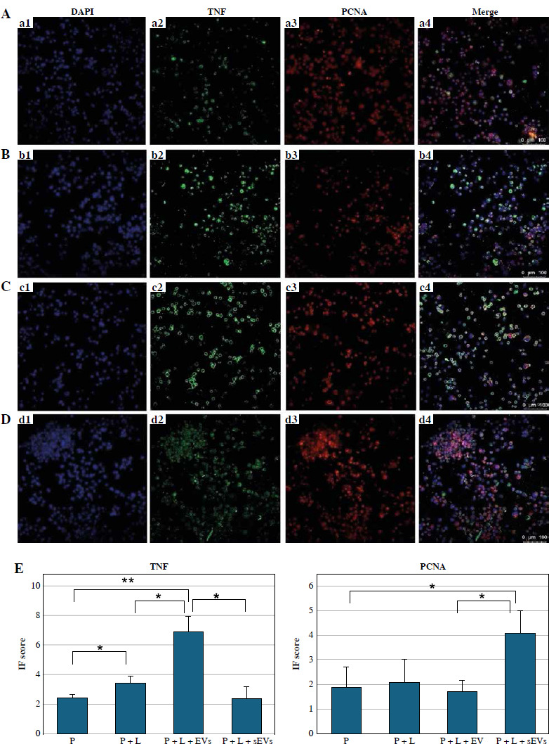 Immunofluorescence staining and confocal microscopic examination of U937 cells. Experimental groups containing: A) PMA (P), B) PMA + LPS (P + L), C) PMA-LPS-extracellular vesicles (P + L + EVs) and D) PMA-LPS-stimulated EVs (P + L + sEVs). Cell nuclei were labeled with DAPI (blue) (a1-d1), TNF was labeled with Alexa flour 488 (green) (a2-d2), PCNA was labeled with Alexa flour 647 (red) (a3-d3) and images were superimposed (merge) (a4-d4). Measurement bar: 100 μm. Bar graph of immunofluorescence (IF) score of images with ImageJ software (E). The analysis was performed with five biological replicates and analysis of five fields per replicate; * indicates statistical significance level (*p < 0.05, **p < 0.01)