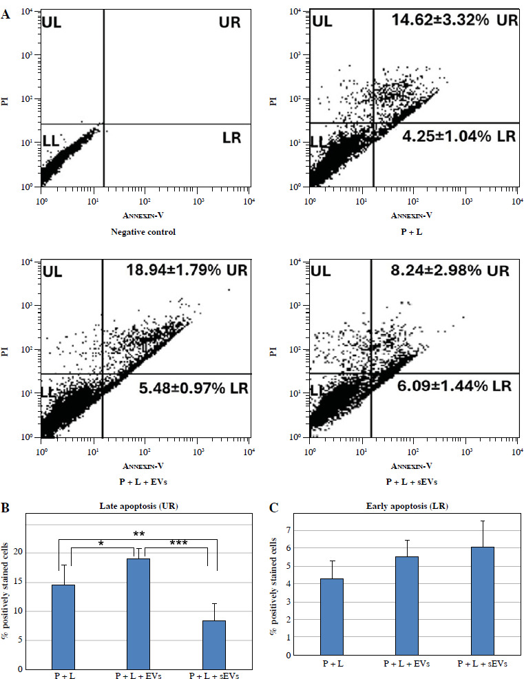 Annexin V-FITC and PI labeling was plotted and calculated from experiments using flow cytometry. Late apoptosis was significantly higher in the P + L + EVs group (*p < 0.05) and significantly lower in the P + L + sEVs group (**p < 0.01) compared to the P + L group. The P + L + sEVs group showed a significantly lower level compared with the P + L + EVs group (***p < 0.001) (Fig. 6B). However, no significant difference was detected in early apoptosis (Fig. 6C).