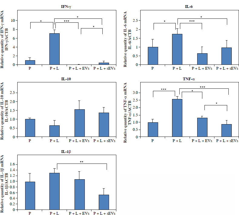 The gene expression of all pro-inflammatory markers was higher in the P + L group compared to that in the P group. TNF-α (***p < 0.001), IFN-γ, and IL-6 (*p < 0.05) showed significant differences, whereas the increase in IL-1β gene expression was not significant. In both the P + L + EVs and P + L + sEVs groups, pro-inflammatory markers IFN-γ, IL-6, TNF-α, and IL-1β (except the EV group) were significantly lower compared to the P + L group (*p < 0.05, **p < 0.01, ***p < 0.001). The higher gene expression of the anti-inflammatory marker IL-10 compared to the P + L group was not statistically significant. When the P + L + EVs and P + L + sEVs groups were compared, a significantly higher value in the latter was observed for IFN-γ (*p < 0.05) and a lower value for TNF-α (*p < 0.05).