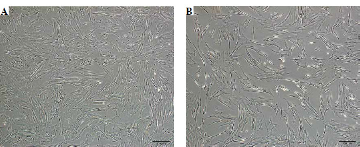 When the WJ-MSCs reached the third passage, they were analyzed using flow cytometry. CD105, CD90, CD73, and CD44 levels were over 90% positive, whereas the hematopoietic markers CD45, CD34, CD106, and HLA-DR were lower than 1% (Fig. 1A).