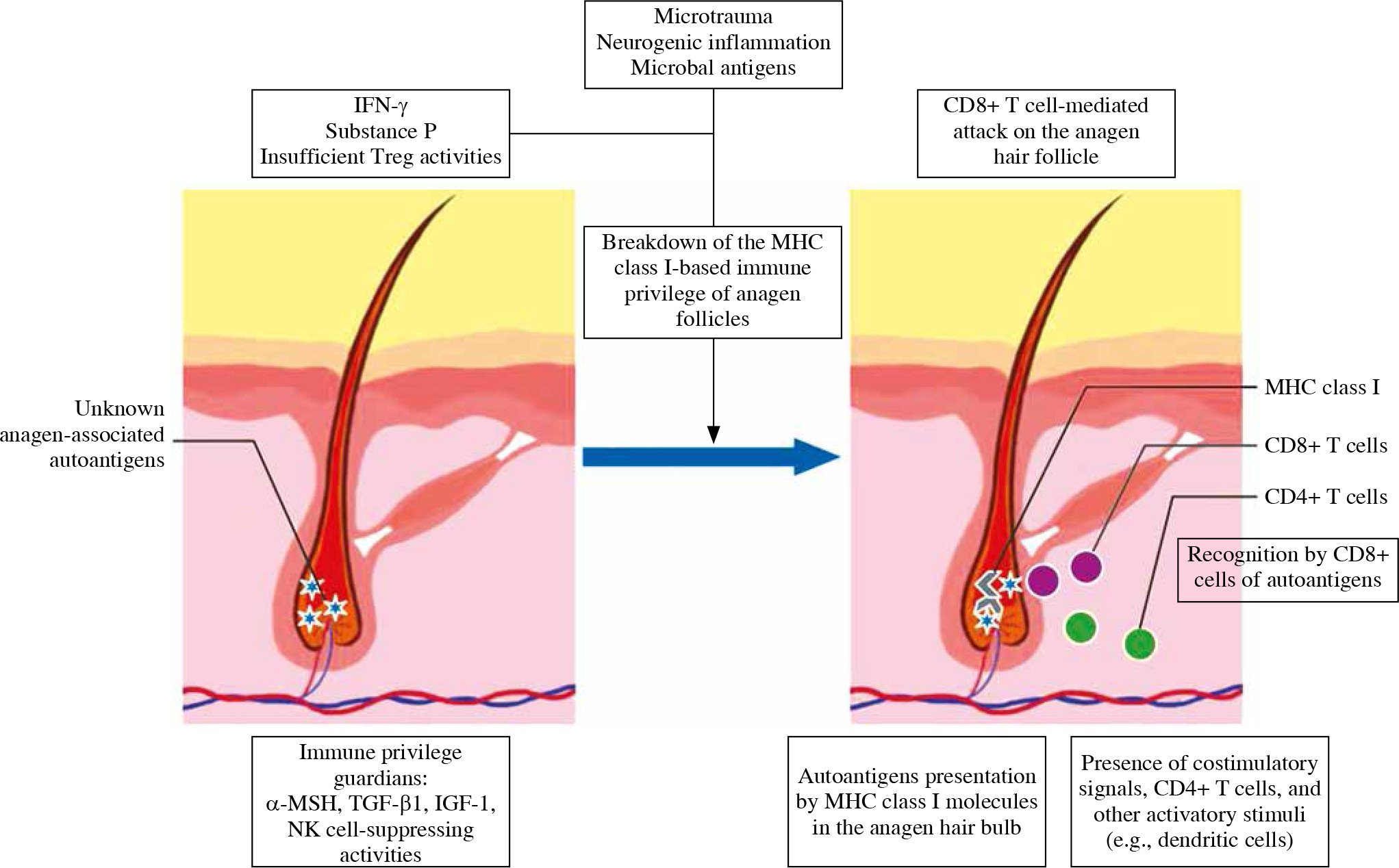 Proposed pathogenesis of alopecia areata. The immunosuppressive milieu of the anagen hair bulb is modulated by immunosuppressive factors, such as α-MSH, TGF-β, and IGF-1, and suppressing NK-cells. Alopecia areata is hair follicle response pattern to various inflammatory events associated with e.g., IFN-γ-induced up-regulation of expression of MHC class Ia inside the hair follicle. Anagen-associated autoantigens are recognized, once they become exposed by ectopic MHC class I. That leads to autoimmune reactions against hair follicle