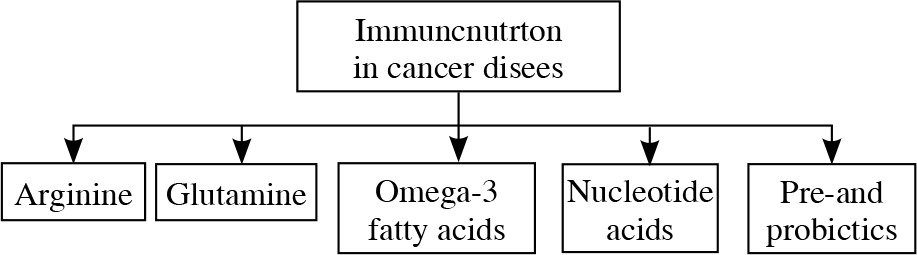 Immunonutrition (arginine, glutamine, omega-3 fatty acids, nucleotide acids, pre- and probiotics) is a modern method of complementary treatment of cancer. It has a positive effect on the functioning of the immune system, including the ability to react against pathogens, reduce the concentration of pro-inflammatory cytokines and maintain the balance of CD4/CD8 lymphocytes. The knowledge about immunonutrition is still limited. It seems reasonable to suggest standard ONS as a preoperative choice due to higher cost and limited retail availability of immunonutrition. Moreover, there is information available about negative effect of using these immunomodulatory components (such as glutamine in breast cancer). Clinical trials usually assess mixture of few substances and that is why it is hard to determine what is the role of immunonutrient alone. In addition, the optimal components of immunonutrients have yet to be adequately determined and may vary for patients based on the proposed procedures. Further studies should assess the effectiveness, as well as safety of immunonutrition usage in patients with cancer. There is a need for properly design randomized and placebo-controlled trials that stratify patients appropriately and determine the optimal composition and duration of therapy regarding isocaloric and isonitrogenous formulas.