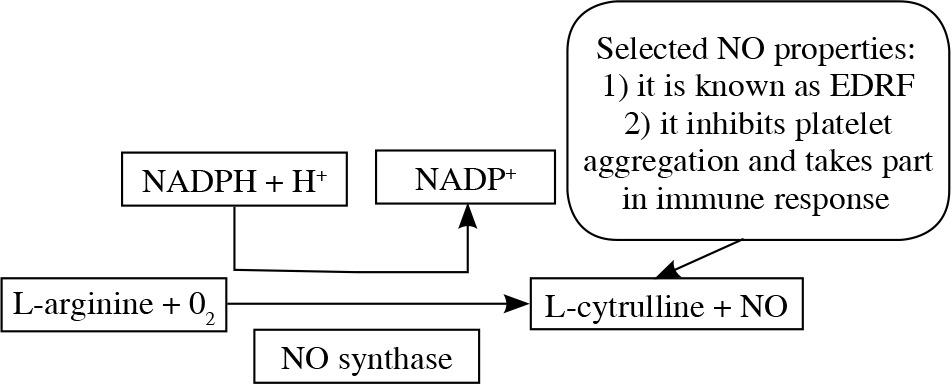Arginine takes part in many processes. Amongst them, the participation in the NO (nitric oxide) production seems really important. In vascular endothelium cells, in the presence of NOS (nitric oxide synthase), argi-nine takes part in the synthesis of nitric oxide (NO) as its sole and unique substrate. This mechanism is presented on Figure 2 [7, 8].