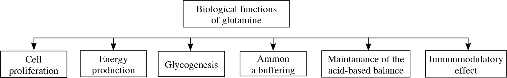 Glutamine is a conditionally essential amino acid, which plays a pivotal role in human body (Fig. 3). Because it is present in abundance in human body and it is not water-soluble, glutamine not always was considered a good candidate for immunonutrition. The participation of this amino acid in many processes however, changed the way it is viewed. Glutamine is an important element of ATP biosynthesis (adenosine triphosphate). As an element of glutathione (after the conversion into glutamic acid), it participates in the protection of the body cells against reactive oxygen species (ROS) [24]. Because it affects the intestinal mucosal integrity and the condition of GALT (gut associated lymphoid tissue), especially when it comes to the inhibition of proinflammatory cytokines production, it is considered a good supplementation for patients during post-surgical trauma [24, 25]. The term „glutaminolysis” is one of the characteristic features of cancer cell metabolism. The transformations of glucose and glutamine in these cells are closely related [26].