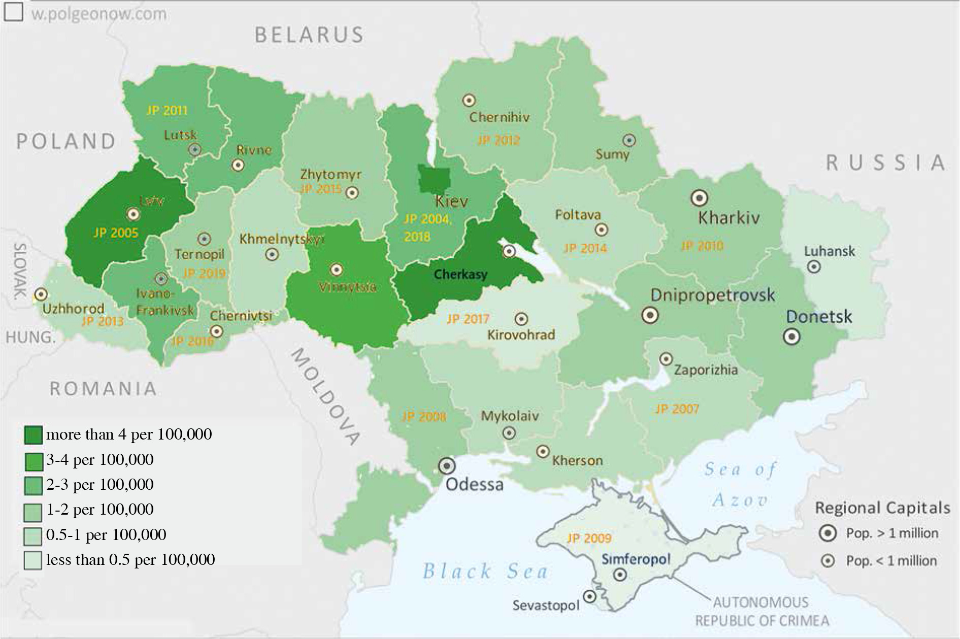 J Project meetings map in Ukraine and the incidence of primary immunodeficiency disorders (PIDs) in different regions