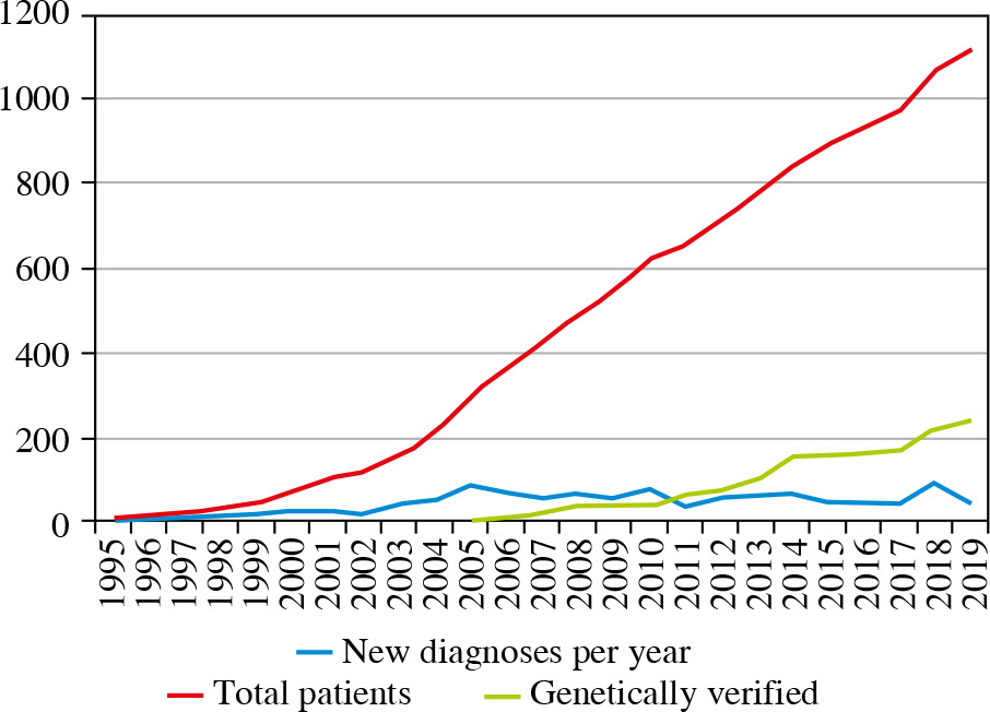 Due to the spread of the J Project activity in many regions of the country, the diagnosis of PIDs has been improved significantly. In contrast to 1997, when the first two patients were found to have Bruton’s disease, more than 1,000 patients were diagnosed with PID in 2020 (Fig. 2). In 2003, the National Registry for Primary Immunodeficiencies was implemented in Ukraine.