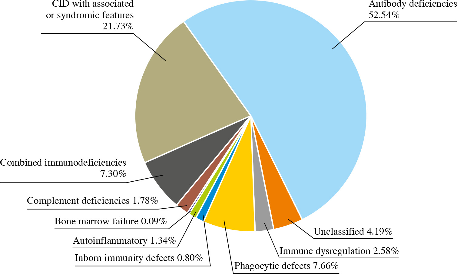 In general, the distribution of the main PIDs in Ukraine is similar to the structure in European countries (Fig. 4). Compared to the European registry, there is the same pattern with regard to the proportion of antibody deficiencies (54% ESID data), combined immunodeficiencies with syndromic features (18%) and combined immunodeficiencies (7%) [5, 6]. The Ukrainian registry presents 64 specified nosological PID entities. Antibody deficiencies are the most common subcategory of PID [590/1,123 (52.54%)], followed by combined immunodeficiencies (CID) with associated or syndromic features [244/1,123 (21.73%)], CID [(82/1,123 (7.3%)], congenital defects of phagocyte number and function [86/1,123 (7.66%)], diseases of immune dysregulation [29/1,123 (2.54%)], complement deficiencies [20/1,123 (1.78%)] and autoinflammatory disorders [20/1,123 (1.34%)].