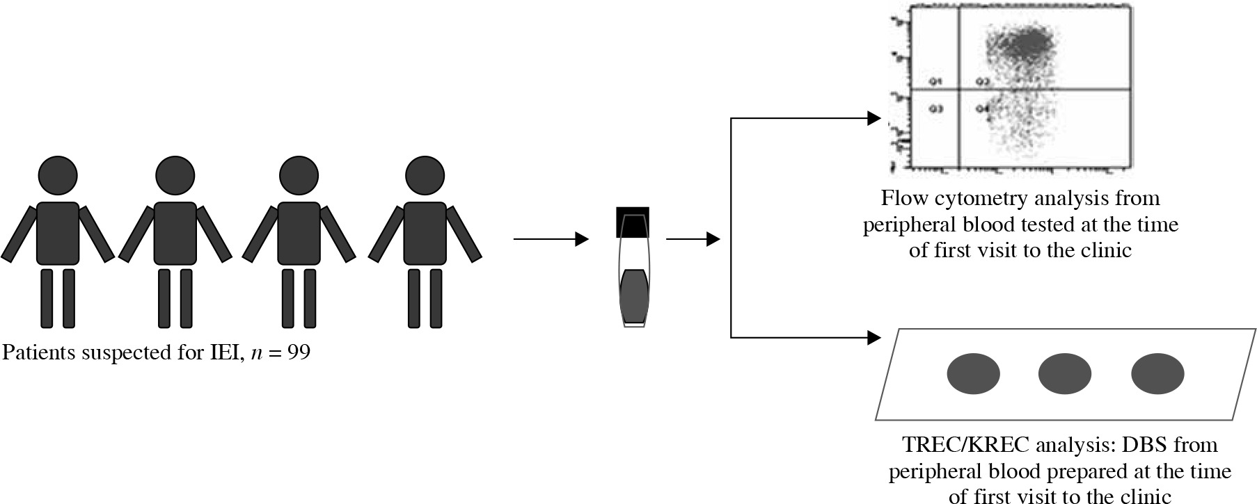 According to study design no additional blood collection or follow-up data of the newborns tested were possible or available. Data from retrospective analysis of previously collected Guthrie card samples (at birth or later) from 34 patients with confirmed IEI [15] were used to test the validity of TREC/KREC cut-off values and the scope of the assay. To assess cut-off values for TREC in adult IEI patients, blood samples from 24 healthy controls, aged 19-68 years (mean 38.6 years), were included in the study. Evaluation of TREC/KREC correspondence with lymphocyte subpopulations, defined by flow cytometry and evaluation of correlations between TREC and KREC with immune cells, were done based on the data from a total of 99 patients with suspected immune disorders (39.4% female, 60.6% male, average age 20.2 years) assessed in the Department of Clinical Immunology at the Alexandrovska University Hospital, Sofia. The main criteria for inclusion of individuals for this analysis was frequent infections. Multicolor flow cytometric immunophenotyping (FACS Canto II, FACSDiva v6.2q, Becton Dickinson) was used to identify CD3+, CD4+, CD8+ and CD19+ cells. Graphical description of this analysis is presented in Figure 1. Informed consent to use medical and immunological records for the aim of this study was obtained from participants or their parents.