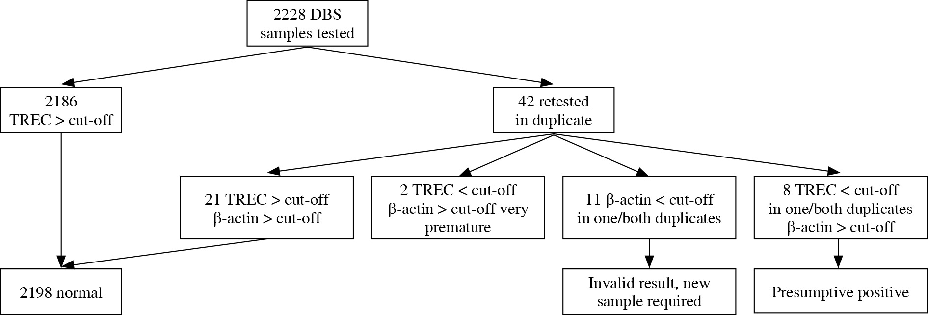 The main limitation of this study is related to the small number of the screened samples. A study with larger sample size as a second step could help to establish population and gestation age based cut-off values and to reduce the retest rate. A very limited number of SCID cases were included in the validation group of CID patients, because, according to the Bulgarian national register of patients with primary immune deficiencies, only 5 patients were registered with severe combined immune deficiency and 6 patients with combined immune deficiency, generally less severe that SCID. Nevertheless, accordance between our results and those reported in larger cohort studies supports their validity and demonstrates the effectiveness of the combined TREC/KREC assay for the purposes of newborn screening at the national level.