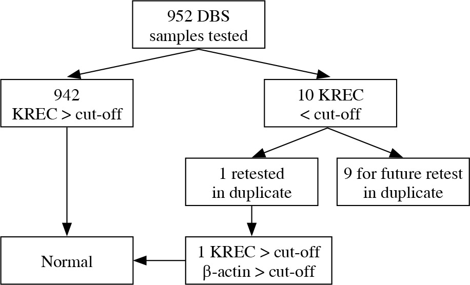 Of the 2228 samples tested, 2186 (98.11%) had TREC values above the cut-off and 42 were retested in duplicate. After retesting, normal TREC values were obtained for 21 of the samples, two of the low-score samples were in very preterm infants, 11 (0.49%) had unsatisfactory replication of the control amplicon, and 8 (0.36%) were rated as probably positive (Fig. 2). 952 samples were tested for KREC. Of them 942 (98.95%) were negative and 10 (1.05%) had KREC below the cut-off (Fig. 3). One of the positive KREC samples was retested in duplicate and gave a normal result. Due to economic and organizational issues the remaining 9 presumably positive samples will be retested at the next stage. Thereafter objective data on the percentage of samples with suspected B-cell lymphopenia will be obtained.