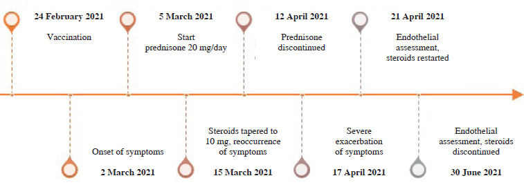 Here, we describe the case of a young woman who developed incomplete systemic capillary leak syndrome (SCLS) after COVID-19 vaccination. A 30-year-old healthy woman with no medical record was vaccinated with AstraZeneca adenovirus vector vaccination (currently Vaxzevria). Six days after vaccination, generalized urticaria occurred. Malaise, fatigue, arthralgia, and myalgia had emerged gradually as prodromal symptoms over the six days following vaccination. She presented to the rheumatology clinic, and a short course of 20 mg of prednisone daily was started, which provided rapid resolution of symptoms. However, the decrease in the glucocorticosteroid dose to 10 mg caused exacerbation in the form of edema of the hands and feet, cold limbs, notable general edema of the subcutaneous tissue, and a drop in blood pressure. Her parameters were: 105/69 mmHg, 90/min, BMI 23.5 kg/m2. Her regular blood pressure was 130/80 mmHg. Physical examination was unremarkable apart from generalized subcutaneous edema. Complete blood count, creatinine, and urinalysis were normal, but there were elevated levels of erythrocyte sedimentation rate, C-reactive protein, transaminases, hypoalbuminemia, and polyclonal hypergammaglobulinemia. Immunofixation and free light chains assays were normal, ruling out monoclonal gammopathy of undetermined significance (MGUS). The anti-SARS-CoV-2 antibody concentration was high and active infection was ruled out by polymerase chain reaction. Oral swab, blood, and urine cultures were negative. Active infection with viral hepatitis A, B, C, cytomegalovirus, Epstein-Barr virus and Borrelia ssp. was excluded. No anti-nuclear antibodies or anti-neutrophil cytoplasmic antibodies were detected. By the association of generalized subcutaneous edema, relative hypotension, and hypoalbuminemia without albuminuria, the diagnosis of vaccination-induced forme fruste of SCLS was made. The patient’s condition was stable enough to forgo the use of intravenous fluids or vasopressors, allowing for treatment on an outpatient basis. The daily dose of 20 mg of prednisone was restarted and tapered slowly over two months, leading to resolution of symptoms. The timeline of events is detailed in Figure 1. The second dose of vaccination was delayed, and the patient was vaccinated 9 months after the end of treatment, with no adverse effects. She remains healthy.