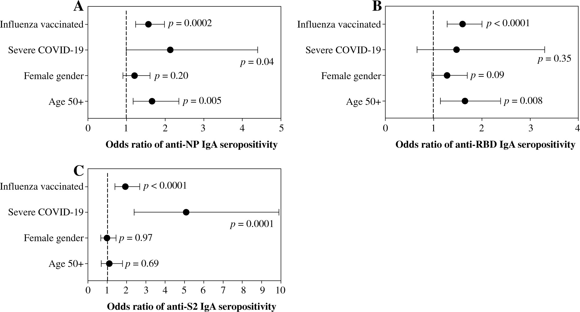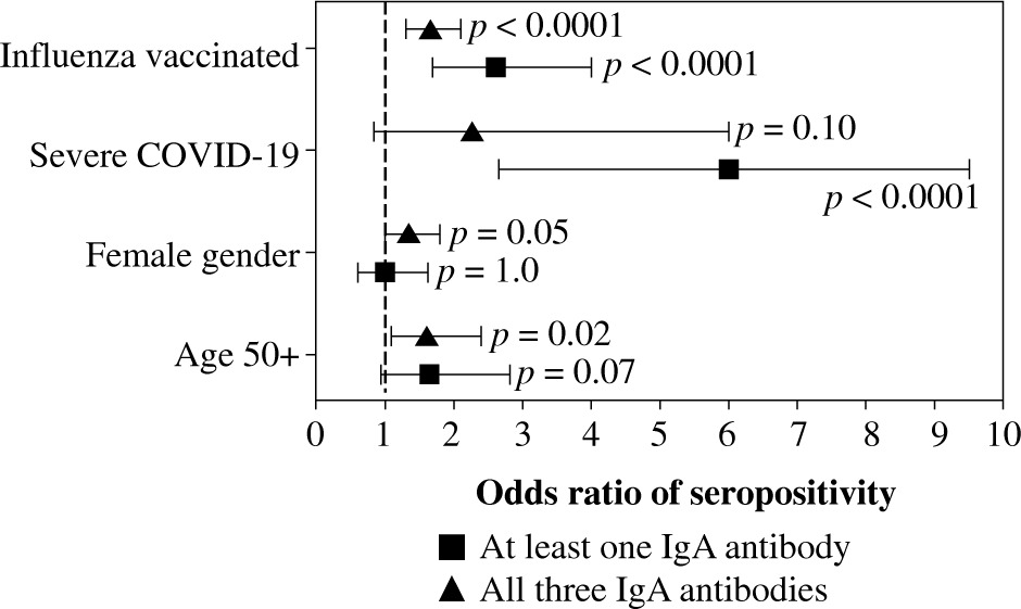 Because age, gender, COVID-19 severity, and influenza vaccination status differentiated the seroprevalence of anti-SARS-CoV-2 IgA antibodies, all of them were included in the multivariate analysis. Being vaccinated against influenza in the 2019/2020 infection season was associated with higher odds of seropositivity of all three IgA antibodies. In addition, individuals aged ≥ 50 years had high odds of anti-NP and anti-RBD seroprevalence, while those who were recovering from severe COVID-19 had higher odds of anti-NP and anti-S2 IgA antibodies (Fig. 1). Influenza vaccination was also associated in multivariate analysis with significantly higher odds of being seropositive for at least one of the considered IgA antibodies as well as being seropositive for all three of them (Fig. 2).