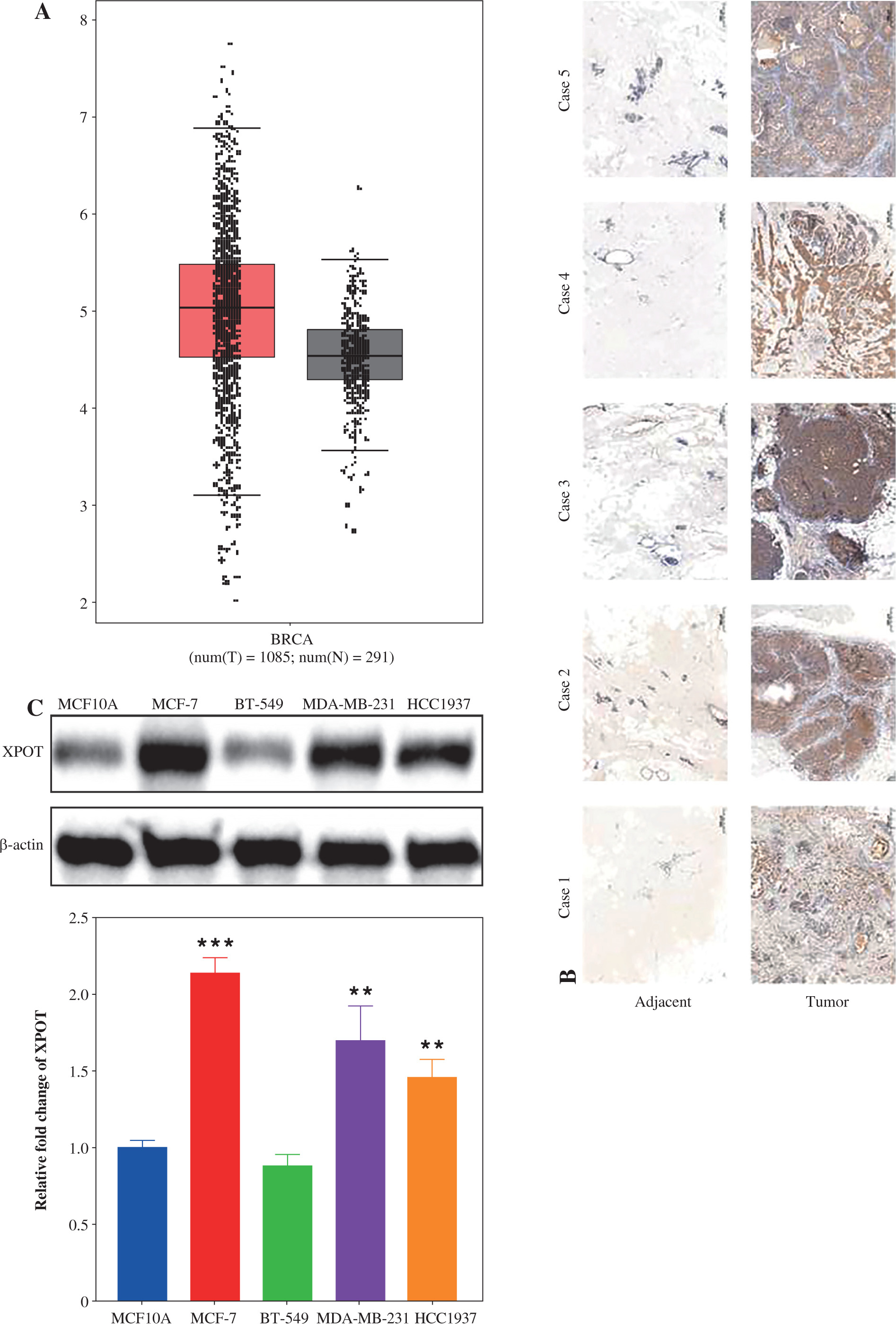 Expression of XPOT in breast cancer. A) Database analyses of XPOT expression. B) XPOT expression in tissues was detected by immunohistochemistry (scale bar: 500 μm). C) XPOT expression in normal cells and cancer cell lines. **p < 0.01, ***p < 0.001, compared with MCF10A cells. Three replicate experiments were performed. Data are exhibited as mean ± standard deviation