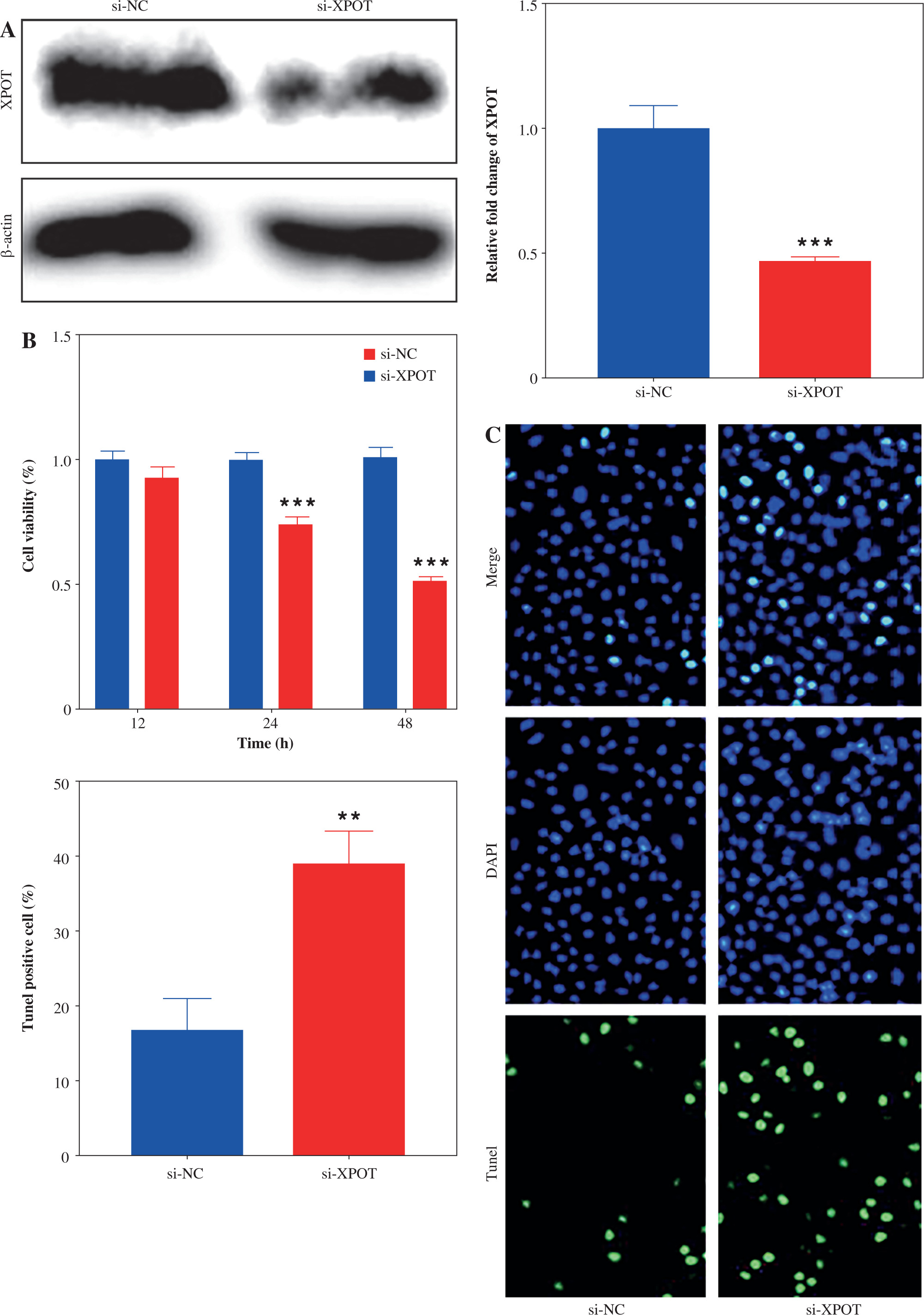 Effects of XPOT on MCF-7 cells. A) Western blotting for transfection efficiency. B) CCK-8 assay for cell viability. C) Levels of programmed cell death detected by TUNEL assay. **p < 0.01, ***p < 0.001, compared with si-NC group. D) Scratch assay of cell metastatic capacity. E) Transwell assay for cell migration and invasion ability. **p < 0.01, ***p < 0.001, compared with si-NC group. Three replicate experiments were performed. Data are presented as mean ± standard deviation
