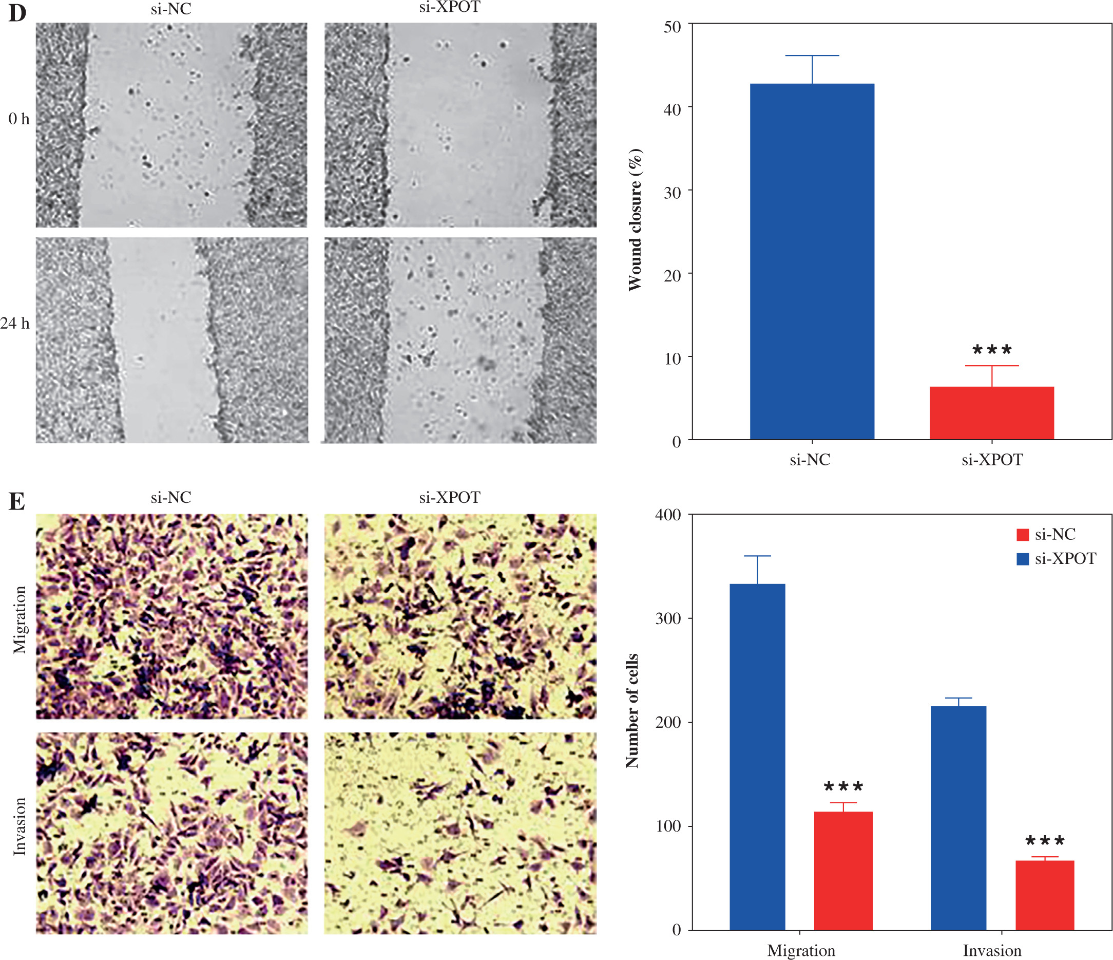 To clarify the effect of XPOT on breast cancer cells, we constructed XPOT small interfering RNA and transfected it into MCF-7 cells. Western blotting showed that si-XPOT significantly inhibited XPOT expression in MCF-7 cells (Fig. 2A). CCK-8 assay results showed that cell viability was significantly suppressed in the si-XPOT group compared to the si-NC group (Fig. 2B). TUNEL staining indicated an increased proportion of TUNEL-positive cells in the si-XPOT group (Fig. 2C). Scratch assay results suggested reduced metastatic motility after XPOT expression interference (Fig. 2D). Transwell assays showed consistent results, with reduced migration and invasion in the si-XPOT group (Fig. 2E). These results indicated that inhibiting XPOT expression suppresses cell viability, promotes cell death, and inhibits cell metastasis.