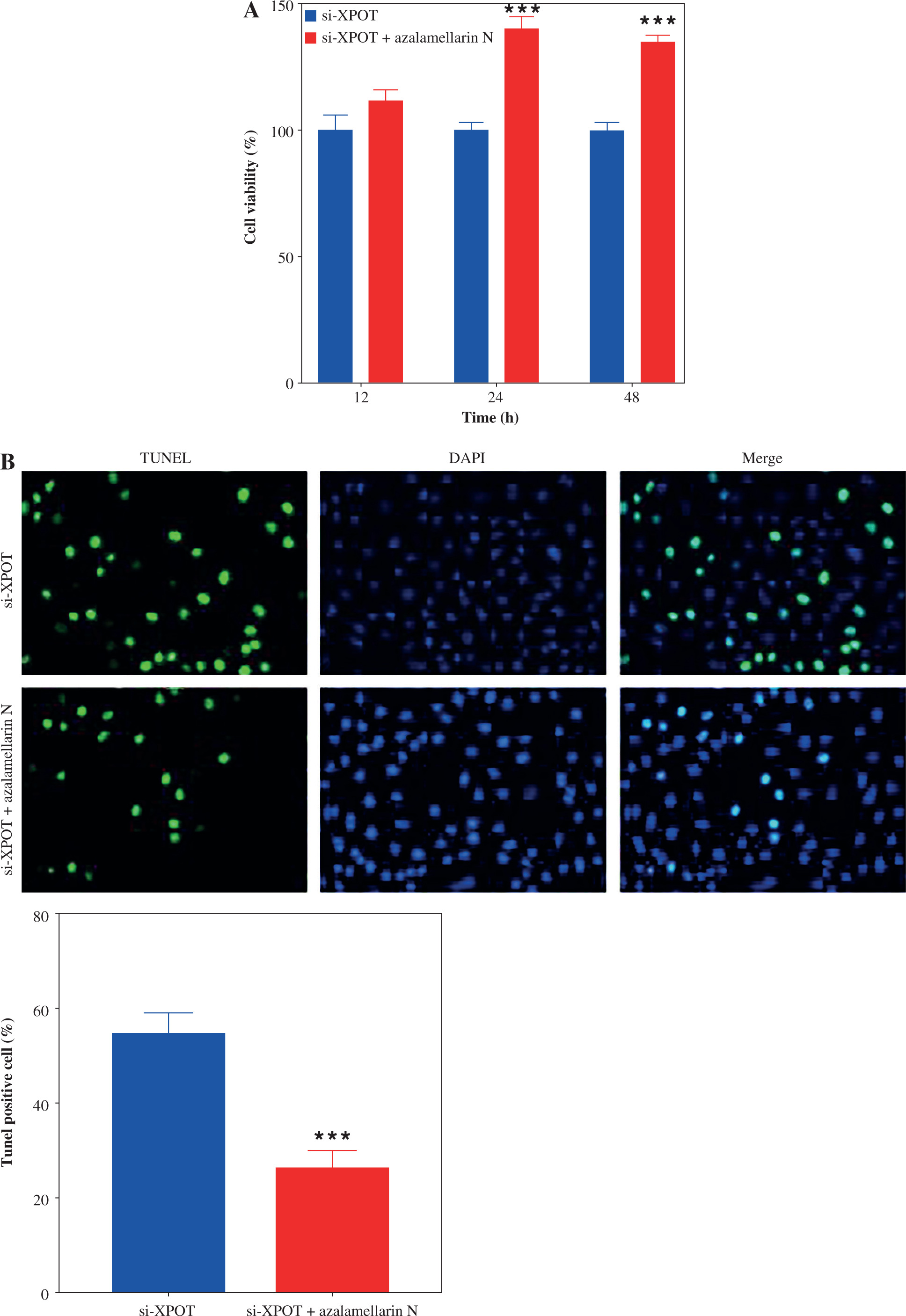 Cell death was assessed using the TUNEL fluorescence assay kit (CST, 25879S, USA). Cells were transfected or treated with azalamellarin N, washed with PBS, fixed, and permeabilized. TdT-labeled working solution was added, and cells were incubated at 37°C for 1 hour. Nuclei were stained with DAPI working solution (Beyotime, C1005, China), washed with PBS twice, and observed under a fluorescence microscope (Olympus, CKX53, Japan).