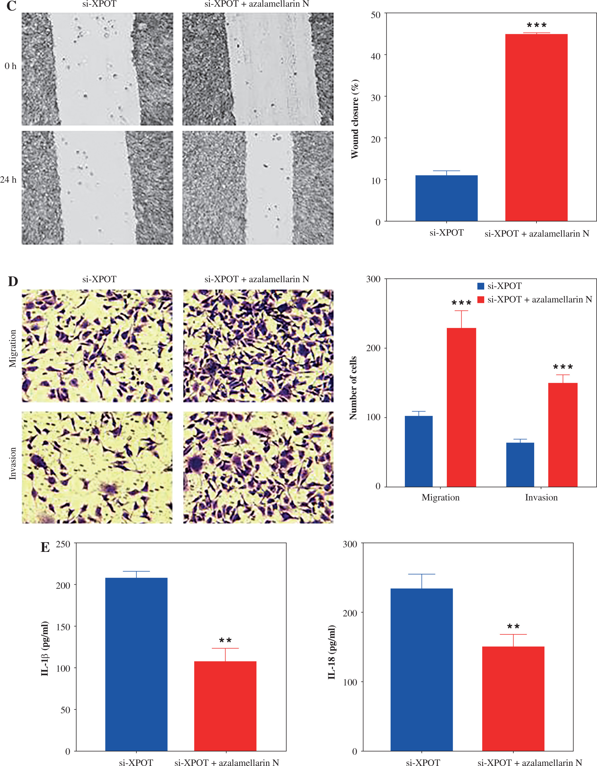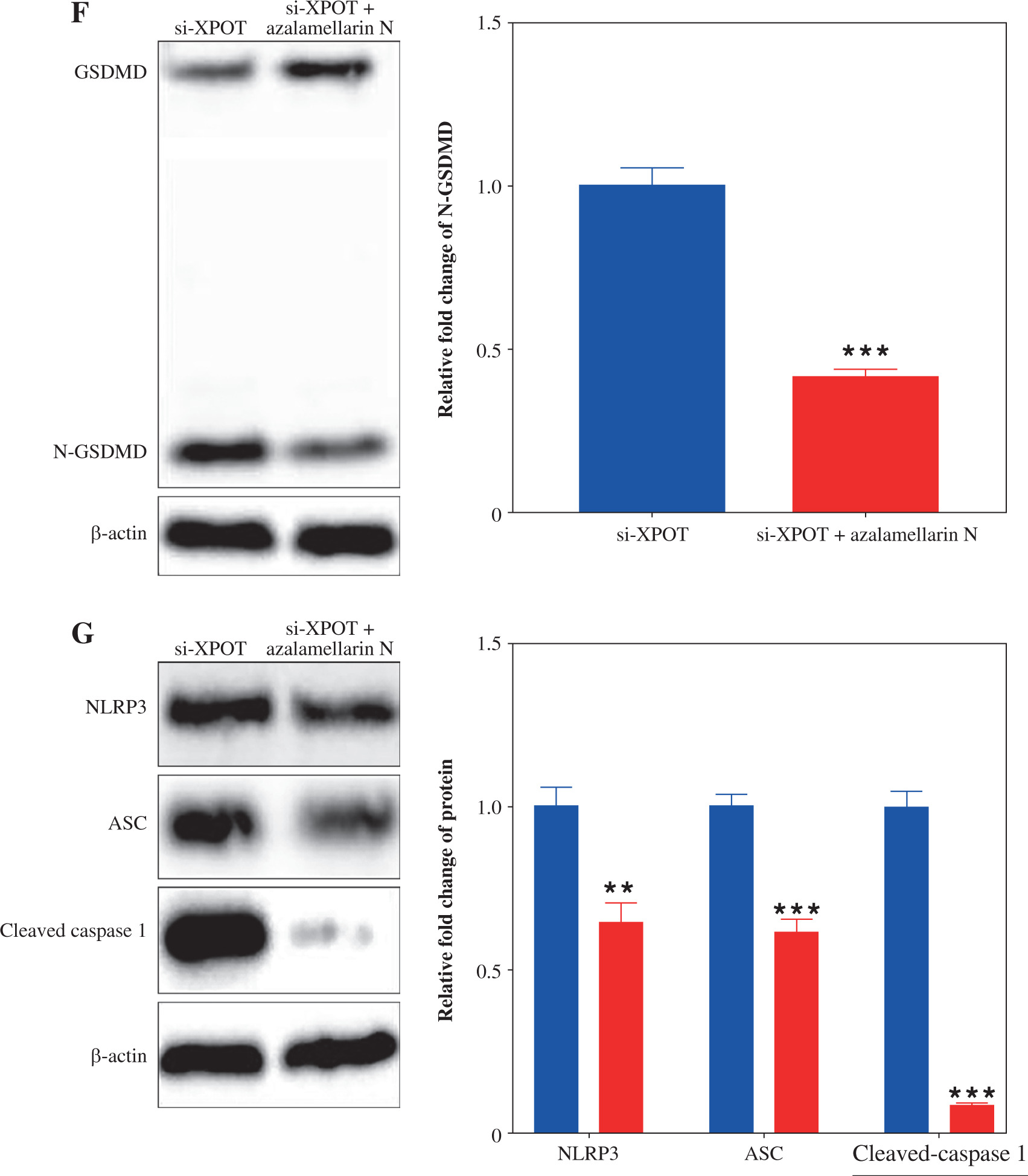 To verify whether XPOT affects breast cancer cell biological processes by regulating pyroptosis, we treated cells with the pyroptosis inhibitor azalamellarin N. CCK-8 results showed that azalamellarin N reversed the suppression of cell viability induced by si-XPOT (Fig. 4A). TUNEL assay results indicated that azalamellarin N reversed the increase in TUNEL-positive cells caused by si-XPOT (Fig. 4B). Scratch assay results showed a higher wound healing rate in the si-XPOT + azalamellarin N group compared to the si-XPOT group (Fig. 4C), and Transwell assay results showed significantly increased migration and invasion in the si-XPOT + azalamellarin N group (Fig. 4D). ELISA results indicated decreased IL-18 and IL-1β secretion after azalamellarin N treatment compared to the si-XPOT group (Fig. 4E). Western blotting results showed decreased N-GSDMD and lower expression of NLRP3, ASC, and cleaved-caspase1 in the si-XPOT + azalamellarin N group compared to the si-XPOT group (Fig. 4F, G). These results suggest that azalamellarin N inhibits pyroptosis induced by si-XPOT.