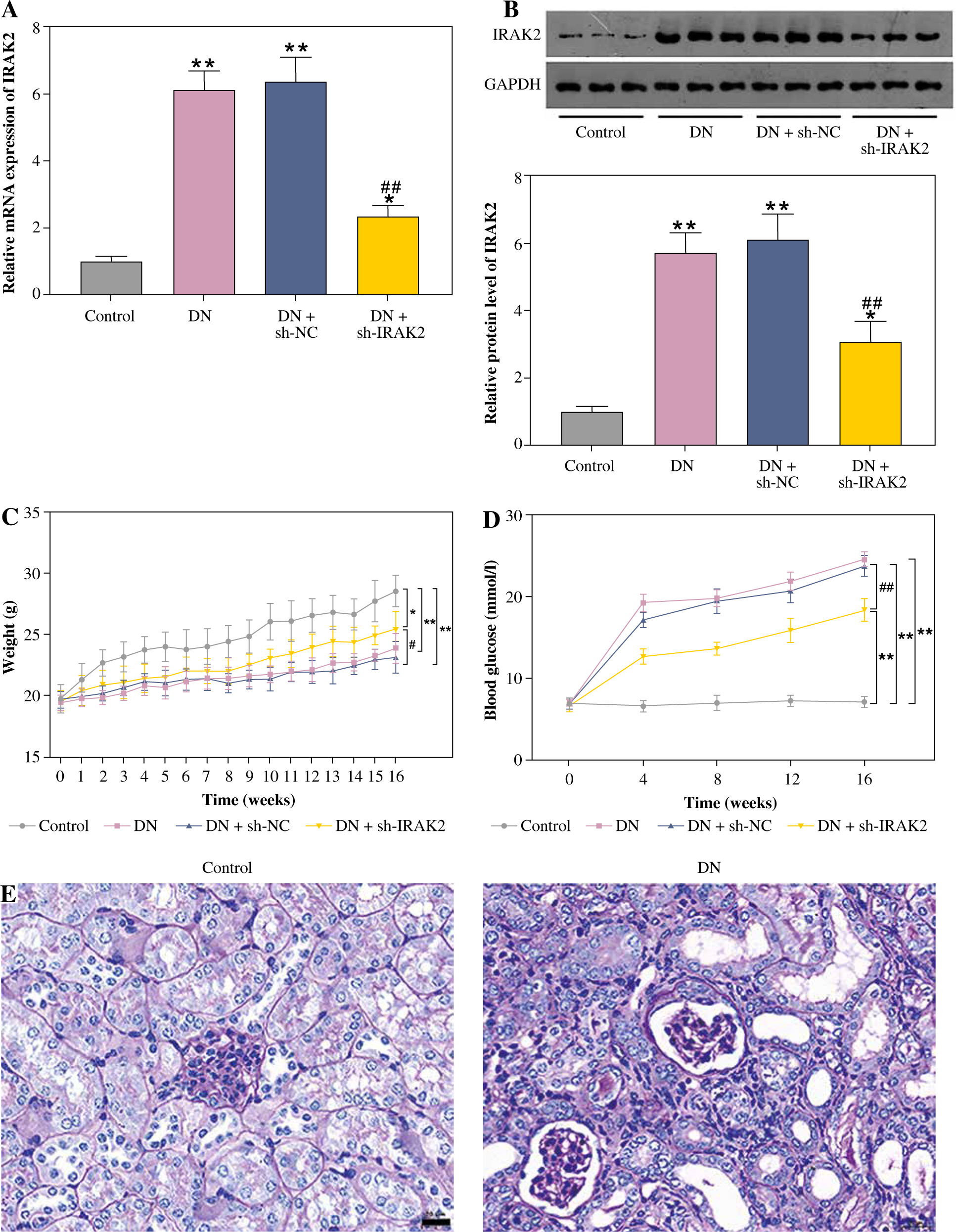 Interleukin-1 receptor-associated kinase 2 (IRAK2) promotes diabetic nephropathy (DN) progression and inflammation in mice. A) RT-qPCR detected IRAK2 mRNA expression. B) Western blotting detected IRAK2 protein expression. C) Body weight and D) blood glucose levels in mice. E) PAS staining of kidney sections (scale bar = 20 μm)