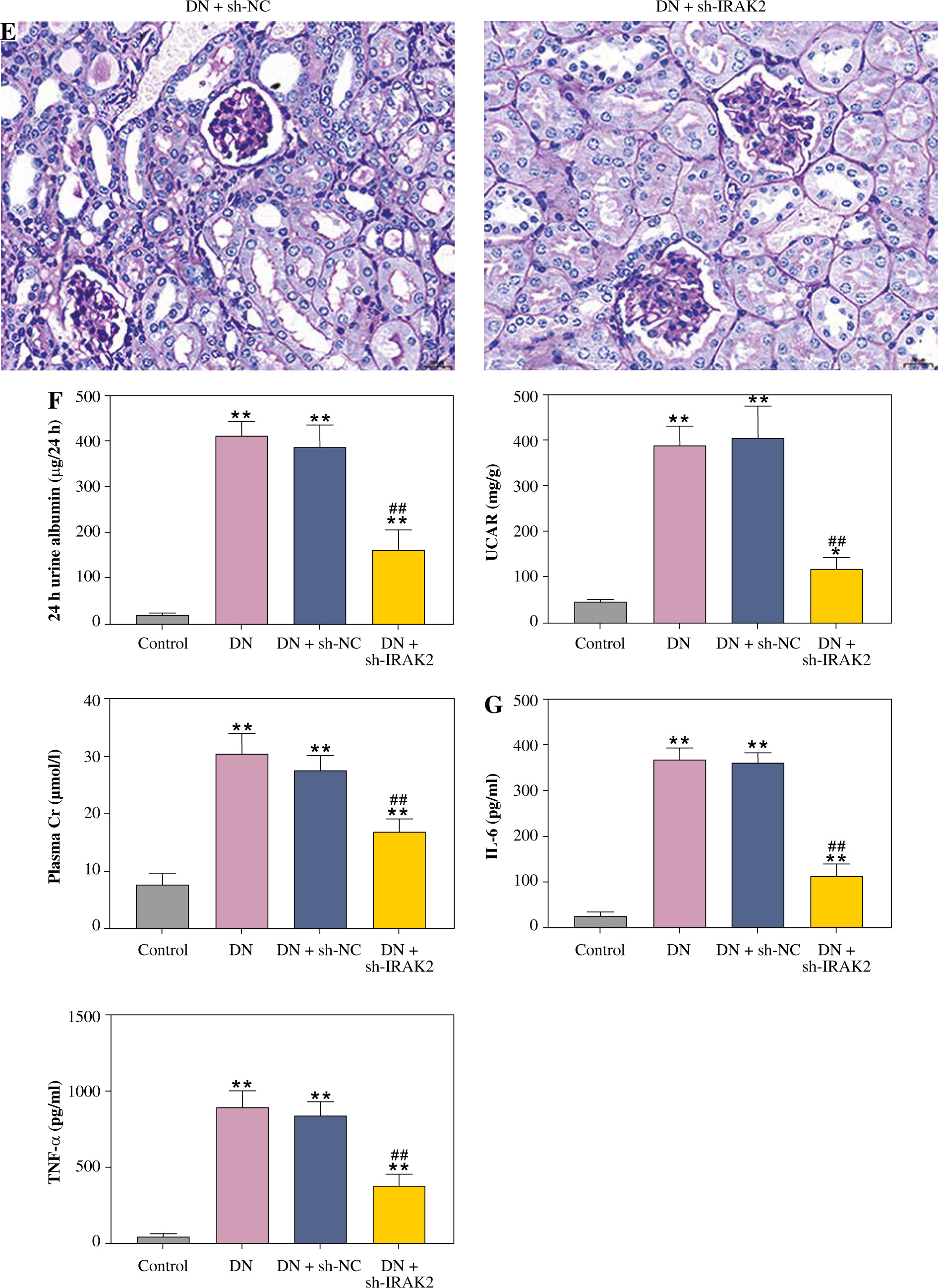 Cont. E) PAS staining of kidney sections (scale bar = 20 μm). F) Urinary protein, UACR, and plasma creatinine levels were measured by ELISA. G) Inflammatory cytokine (interleukin-6, tumor necrosis factor (TNF)-α, TNF-1R, and TNF-2R) levels were measured by ELISA. DN model mice were generated by intraperitoneal injection of streptozotocin. Data are presented as mean ±SD. *p < 0.05, **p < 0.01 compared with control group, #p < 0.05, ##p < 0.01 compared to DN + sh-NC group