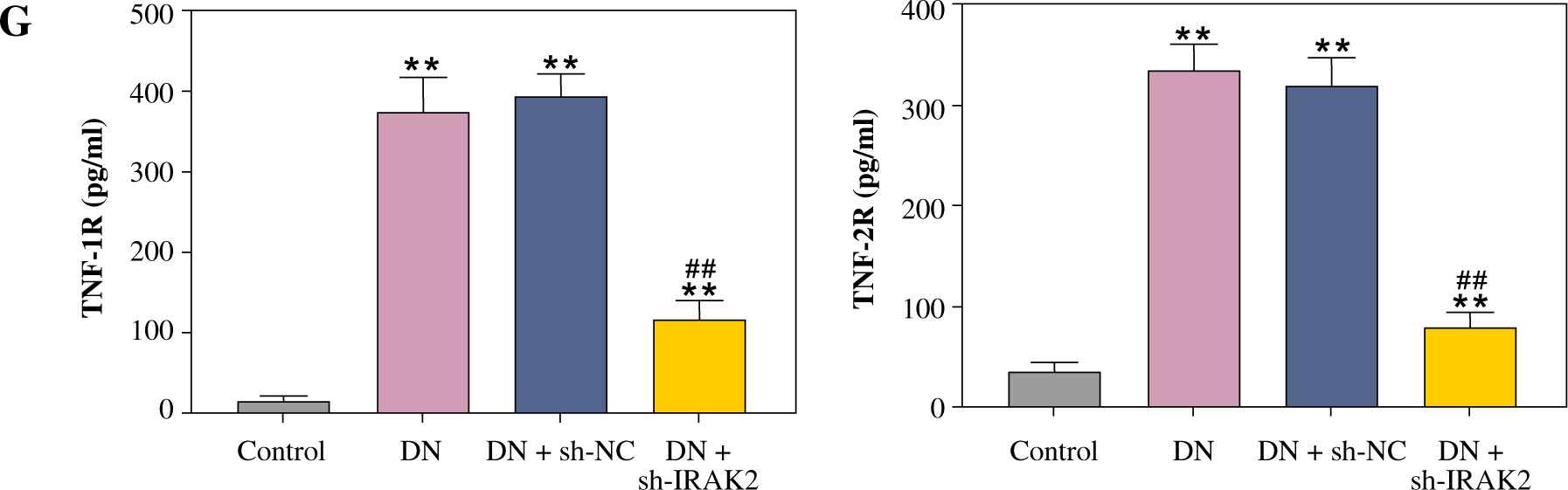 Inflammation is a key factor that contributes to the pathogenesis of DN. We detected the levels of some main inflammatory cytokines (IL-6, TNF-α, TNF-1R, and TNF-2R) associated with DN using ELISA. Compared with the control mice, the levels of IL-6, TNF-α, TNF-1R, and TNF-2R were elevated in the DN mice (p < 0.01, Fig. 1G). IRAK2 downregulation significantly reduced the levels of these inflammatory cytokines (p < 0.01, Fig. 1G).