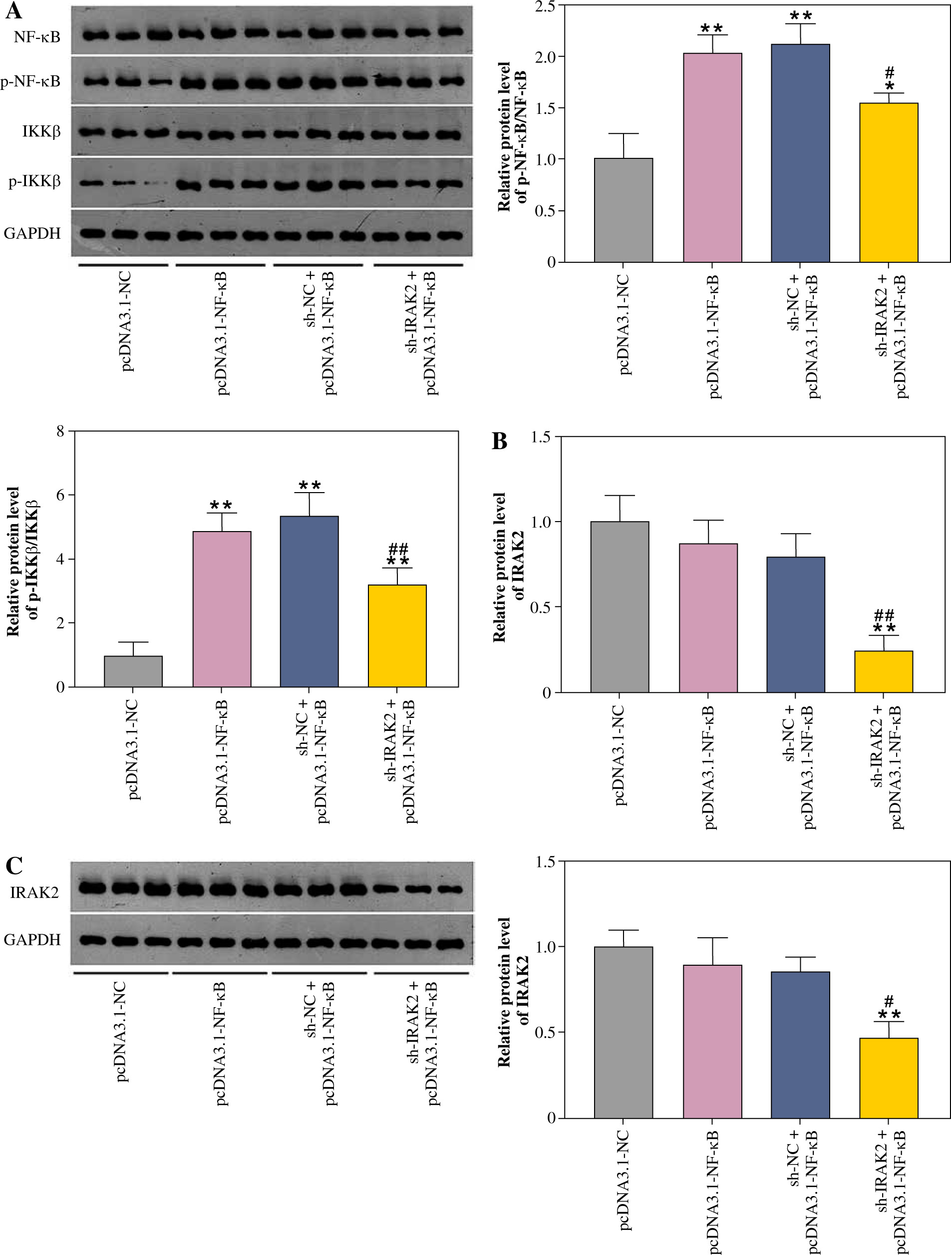 Short hairpin RNA (shRNA) targeting IRAK2 (shIRAK2) and a negative control shRNA (sh-NC) were designed using the Designer of Small Interfering RNA website. The sequence of sh-IRAK2 was SS: CAGTATCCTTGTAAGATAA and AS: TTATCTTACAAGGATACTG. Plasmid pcDNA3.1 and pcDNA3.1-NF-κB were constructed by GenePharm.