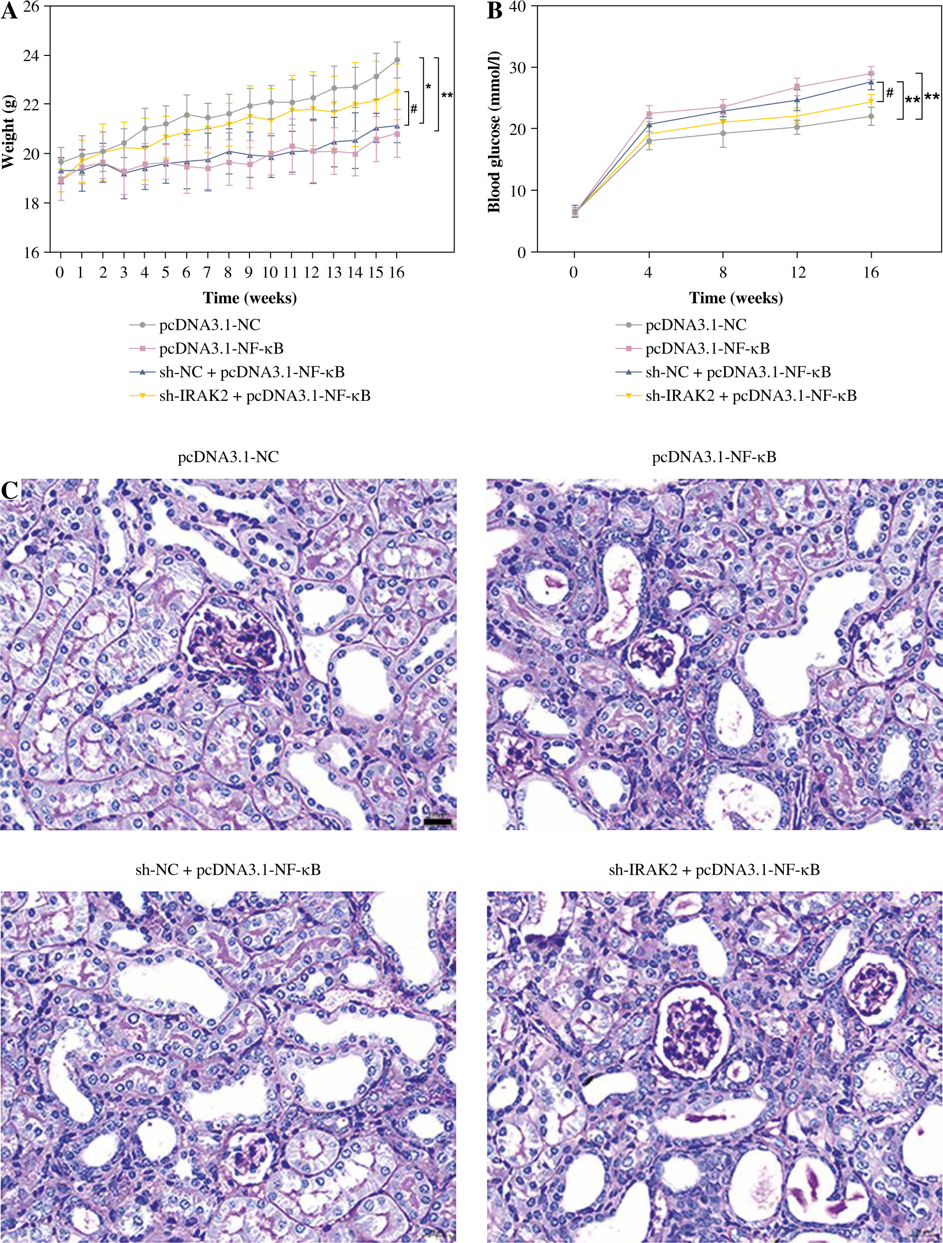Mice were randomly divided into eight groups (n = 6 per group): Control, DN, DN + sh-NC, DN + sh-IRAK2, pcDNA3.1-NC, pcDNA3.1-NF-κB, sh-NC + pcDNA3.1NF-κB, and sh-IRAK2 + pcDNA3.1-NF-κB. DN results from diabetes mellitus type 1, which is commonly induced by streptozotocin (STZ). In this study, DN was induced in mice by a single intraperitoneal injection of STZ (50 mg/kg body weight; Sigma MO, USA) dissolved in citrate buffer (0.1 M, pH 4.5) each day for five consecutive days. The control mice received equal volumes of citrate buffer. Diabetes was confirmed by blood glucose measurements using a glucometer (Roche, Switzerland) at post-injection day three. Mice with blood glucose levels ≥ 16.7 mmol/l were considered diabetic [16]. Model mice were then transfected with sh-IRAK2 or pcDNA3.1-NF-κB according to the grouping.