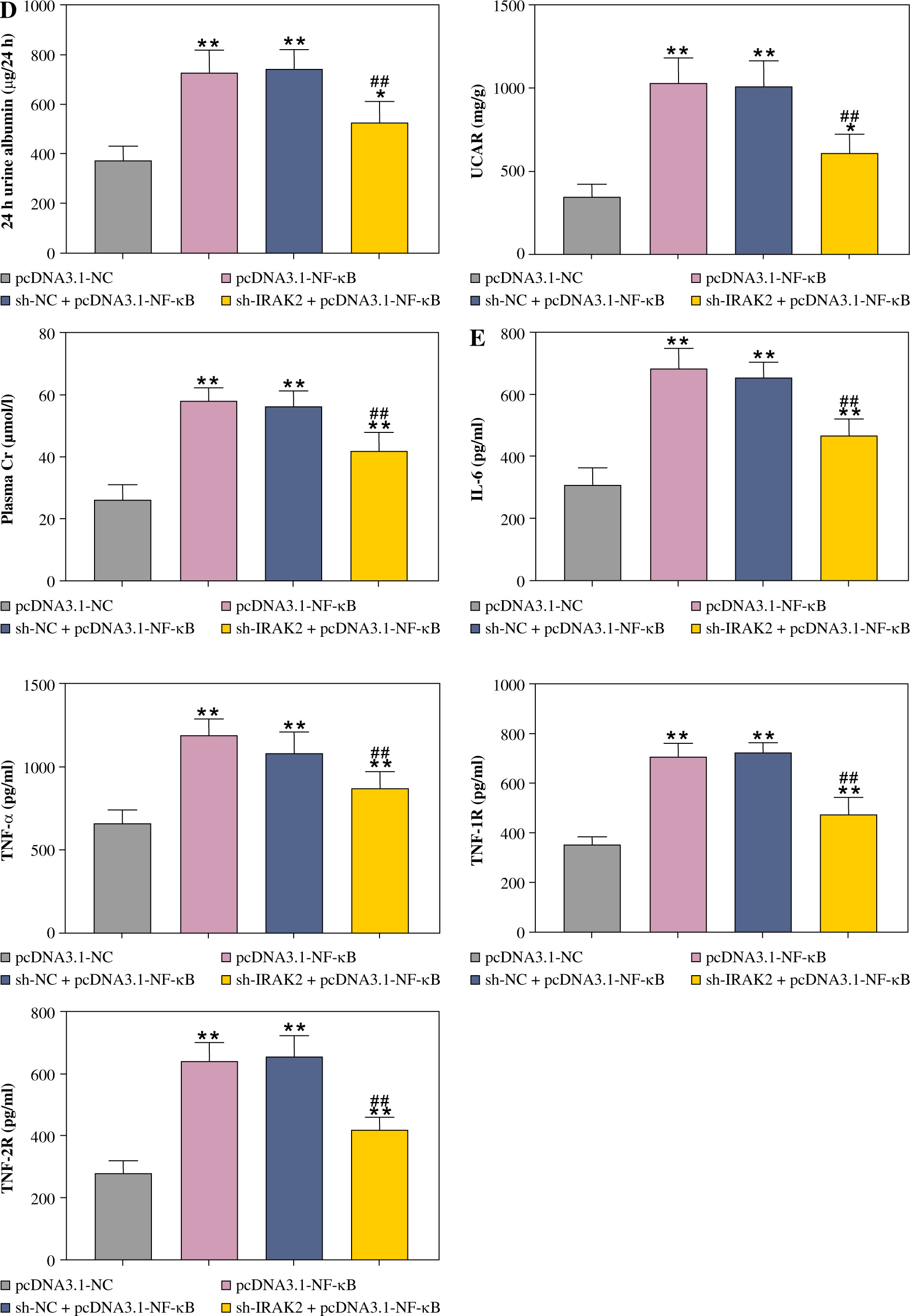 Cont. D) Urinary protein, UACR, and plasma creatinine levels were measured by ELISA. E) Inflammatory cytokine (IL-6, TNF-α, TNF-1R, and TNF-2R) levels were determined by ELISA. Data are presented as mean ±SD. *p < 0.05, **p < 0.01 compared to pcDNA3.1-NC, #p < 0.05, ##p < 0.01 compared to sh-NC + pcDNA3.1- NF-κB. DN model mice were transfected with sh-IRAK2 and/or pcDNA3.1-NF-κB