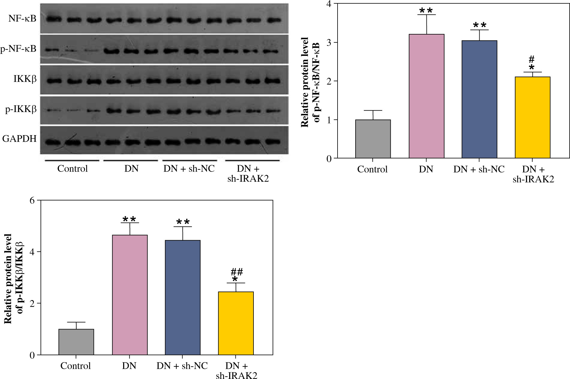 Interleukin-1 receptor-associated kinase 2 (IRAK2) activates the nuclear factor-kappa B (NF-κB) signaling pathway in diabetic nephropathy (DN) model mice. Protein expression levels of p-NF-κB/NF-κB and p-IKKβ/ IKKβ were determined by western blotting. DN model mice were generated by intraperitoneal injection of streptozotocin. Data are presented as mean ±SD. *p < 0.05, **p < 0.01 compared to control group, #p < 0.05, ##p < 0.01 compared to DN + sh-NC group