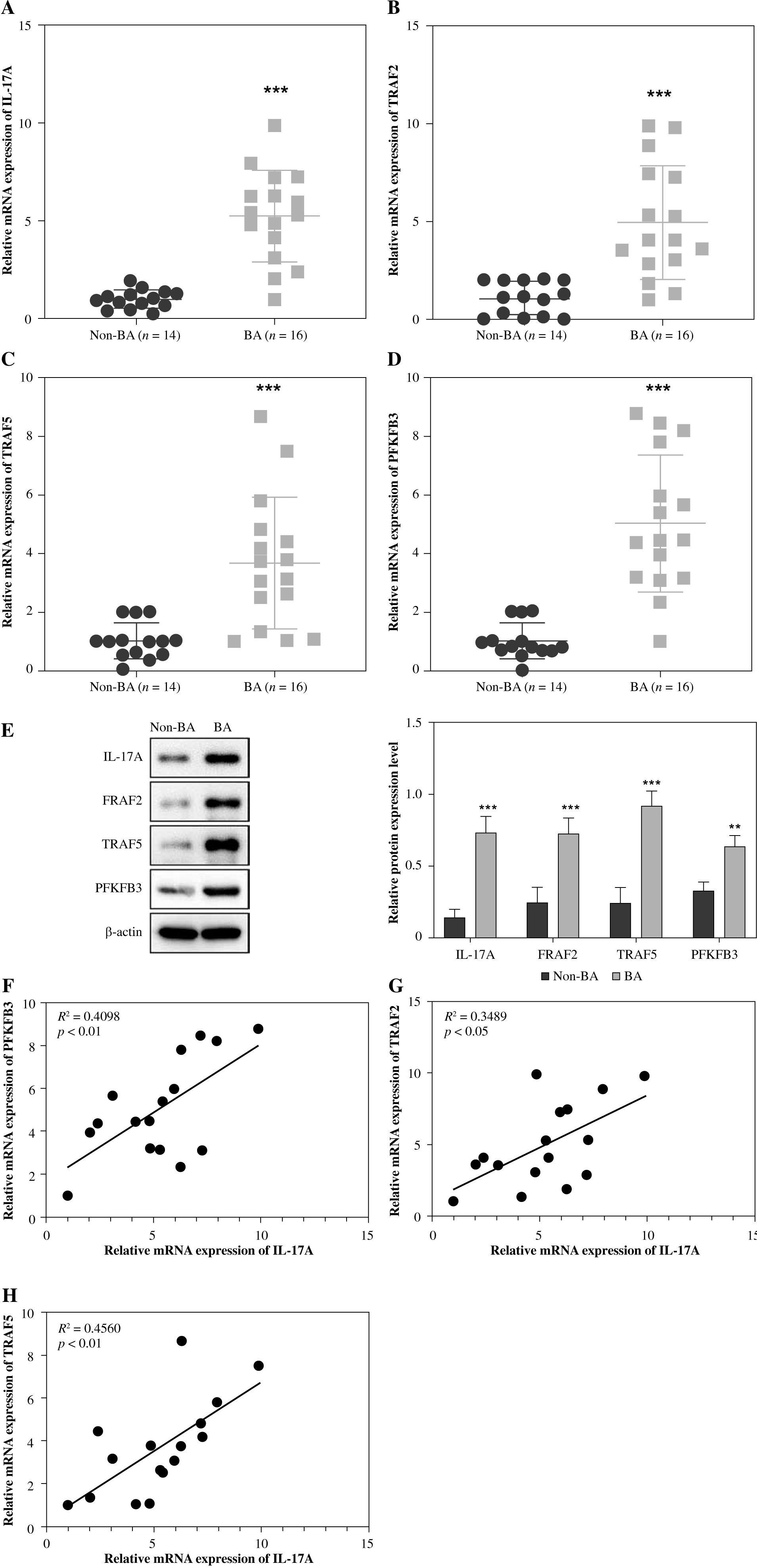 Interleukin 17A, TRAF2, TRAF5, and PFKFB3 expression levels were abnormally elevated in the liver tissues of patients with biliary atresia (BA). Liver tissue samples from 16 patients with BA and 14 patients with an anicteric choledochal cyst without biliary atresia (non-BA) were collected. A-D) IL-17A, TRAF2, TRAF5, and PFKFB3 expression was detected using RT-qPCR (BA: n = 16; non-BA: n = 14). E) IL-17A, TRAF2, TRAF5, and PFKFB3 protein levels were measured by western blot analyses (n = 3, the experiments were conducted three times independently). **p < 0.01, ***p < 0.001; Student’s t-test (A-E). F) The correlation of expression level between IL-17A and PFKFB3 was evaluated by Pearson’s correlation analysis. G) The correlation of expression level between IL-17A and TRAF2 was evaluated by Pearson’s correlation analysis. H) The correlation of expression level between IL-17A and TRAF5 was evaluated by Pearson’s correlation analysis. **p < 0.01, ***p < 0.001; Pearson’s correlation analysis (F-H)
