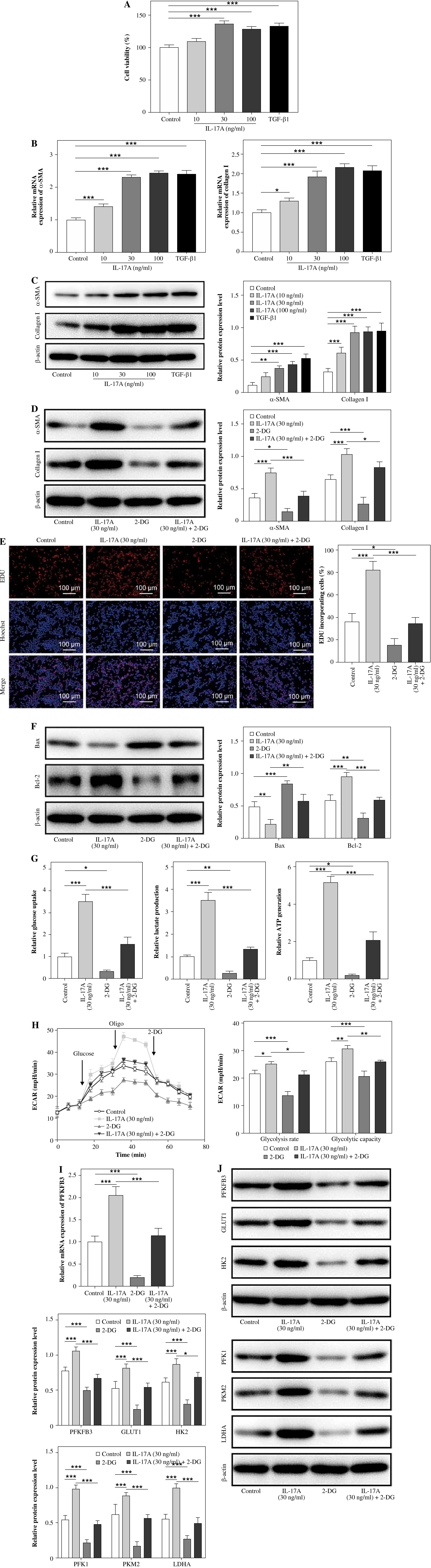 Interleukin 17A promoted glycolysis to facilitate HSC activation and fibrosis. LX-2 cells were treated with IL-17A (10, 30, and 100 ng/ml) or TGF-β1. A) Cell viability was examined using CCK-8. B, C) α-SMA and collagen I expression levels were determined by RT-qPCR and western blot analyses. LX-2 cells were treated with IL-17A (30 ng/ml) with/without 2-DG (a glycolytic inhibitor) D) α-SMA and collagen I expression levels were evaluated by western blot analyses. *p < 0.05, **p < 0.01, ***p < 0.001. One-way analysis of variance (ANOVA) was employed for A-J. E) Cell proliferation was detected using the EdU assay. Scale bar: 100 μm. F) Bax and Bcl-2 expression levels were examined by western blot analyses. G) Glucose uptake, lactate production, and ATP levels were determined using commercial kits. *p < 0.05, **p < 0.01, ***p < 0.001. One-way analysis of variance (ANOVA) was employed for A-J. H) ECAR was measured after sequential injections of glucose, oligomycin (Oligo), and 2-deoxyglucose (2-DG); ECAR acted as an indicator of glycolysis flux and glycolytic capacity. I) PFKFB3 expression was evaluated by RT-qPCR. J) PFKFB3, PFK1, PKM2, LDHA, GLUT1, and HK2 expression levels were investigated using western blot analyses. n = 3; all experiments were conducted three times independently. *p < 0.05, **p < 0.01, ***p < 0.001. One-way analysis of variance (ANOVA) was employed for A-J