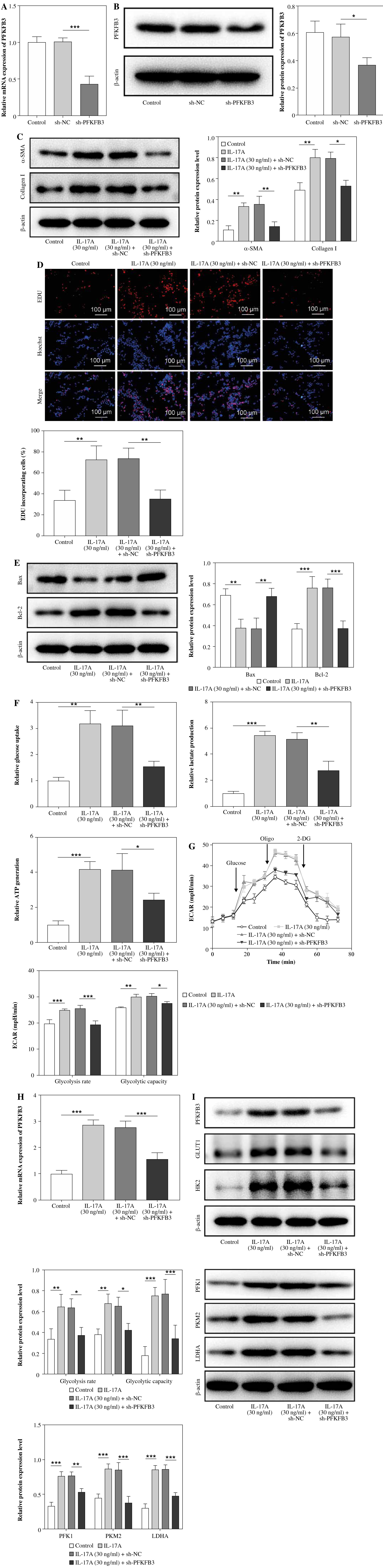PFKFB3 silencing abolished IL-17-induced glycolysis in HSCs. A, B) PFKFB3 expression in LX-2 cells with sh-PFKFB3 transfection was measured using RT-qPCR and western blot analyses. LX-2 cells were subjected to IL-17 (30 ng/ml) treatment alone or together with sh-PFKFB3 transfection. C) α-SMA and collagen I expression levels were evaluated by western blot analyses. D) Cell proliferation was detected using the EdU assay. Scale bar: 100 μm. *p < 0.05, **p < 0.01, ***p < 0.001. One-way analysis of variance (ANOVA) was employed for A-I. E) Bax and Bcl-2 expression was examined by western blot analyses. F) Glucose uptake, lactate, and ATP levels were determined using commercial kits. G) ECAR was measured as an indicator of glycolysis flux and glycolytic capacity. *p < 0.05, **p < 0.01, ***p < 0.001. One-way analysis of variance (ANOVA) was employed for A-I. H) PFKFB3 expression was evaluated by RT-qPCR. I) PFKFB3, PFK1, PKM2, LDHA, GLUT1, and HK2 expression was investigated using western blot analyses. n = 3; all experiments were conducted three times independently. *p < 0.05, **p < 0.01, ***p < 0.001. Oneway analysis of variance (ANOVA) was employed for A-I