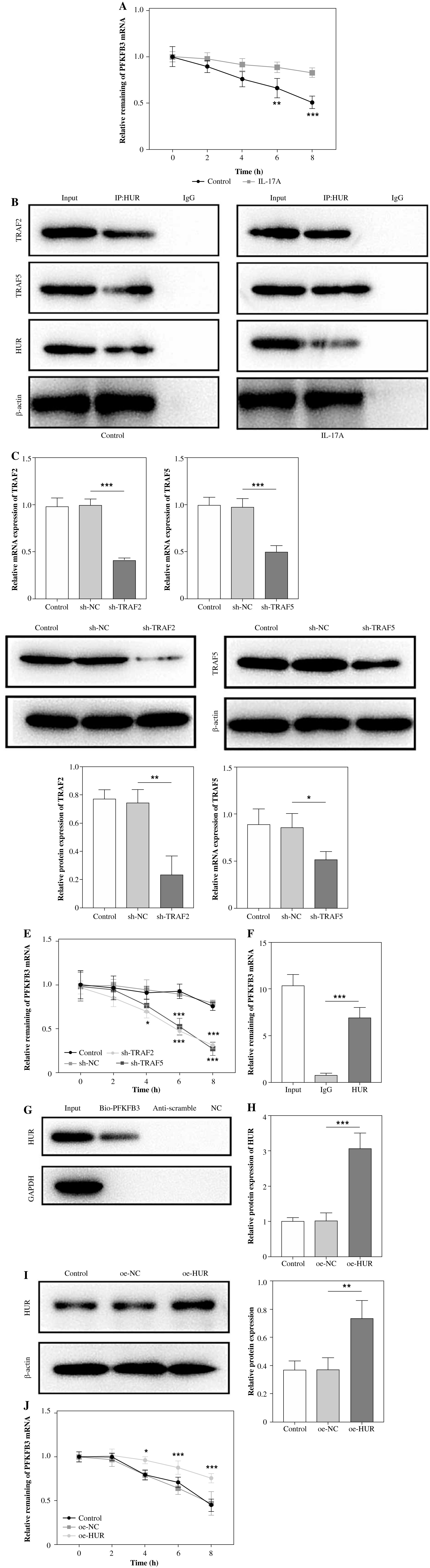 Interleukin 17 maintained the stability of PFKFB3 mRNA by inducing formation of TRAF2/TRAF5/HuR complex. A) The stability of PFKFB3 mRNA was evaluated by RT-qPCR in IL-17-treated LX-2 cells upon actinomycin D treatment. B) The interactions among HuR, TRAF2, and TRAF5 were verified by Co-IP in LX-2 cells without/with IL-17A treatment. C) TRAF2 and TRAF5 expression levels were measured by RT-qPCR and western blot analyses in LX-2 cells with sh-TRAF2 or sh-TRAF5 transfection. *p < 0.05, **p < 0.01, ***p < 0.001. Student’s t-test for (A) and one-way analysis of variance (ANOVA) test for C-F. D) TRAF2 and TRAF5 expression levels were measured by RT-qPCR and western blot analyses in LX-2 cells with sh- TRAF2 or sh-TRAF5 transfection. E) The stability of PFKFB3 mRNA was evaluated by RT-qPCR in sh-TRAF2 or sh-TRAF5-transfected LX-2 cells upon actinomycin D treatment. F, G) The interaction between HuR and PFKFB3 was validated by RIP and RNA pull-down. H) HuR expression was determined using RT-qPCR and western blot analyses in LX-2 transfected with oe-HuR. *p < 0.05, **p < 0.01, ***p < 0.001. One-way analysis of variance (ANOVA) test for C-F. I) HuR expression was determined using RT-qPCR and western blot analyses in LX-2 transfected with oe-HuR. J) The stability of PFKFB3 mRNA was evaluated by RT-qPCR in LX-2 cells with oe-HuR transfection upon actinomycin D treatment. n = 3; all experiments were conducted three times independently. *p < 0.05, **p < 0.01, ***p < 0.001. One-way analysis of variance (ANOVA) test H-J