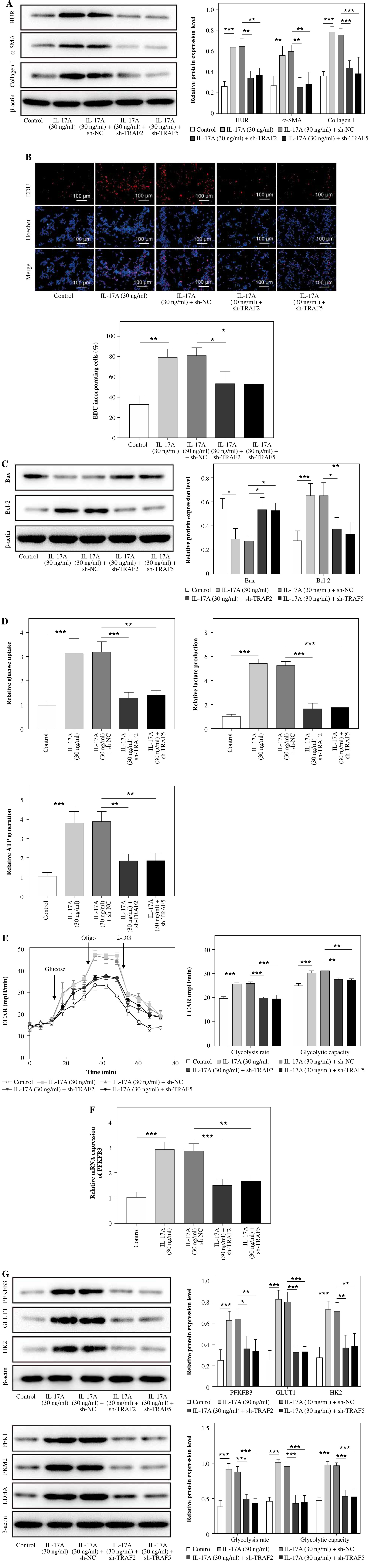 TRAF2 or TRAF5 knockdown impaired IL-17A-induced glycolysis in HSCs. LX-2 cells underwent sh-TRAF2 or sh-TRAF5 transfection following IL-17A (30 ng/ml) treatment. A) HuR, α-SMA, and collagen I expression levels were determined by western blot analyses. B) Cell proliferation was detected using the EdU assay. Scale bar: 100 μm. n = 3; all experiments were conducted three times independently. *p < 0.05, **p < 0.01, ***p < 0.001. One-way analysis of variance (ANOVA) was employed for A-G. C) Bax and Bcl-2 expression was examined by western blot analyses. D) Glucose uptake and lactate and ATP levels were determined using commercial kits. n = 3; all experiments were conducted three times independently. *p < 0.05, **p < 0.01, ***p < 0.001. One-way analysis of variance (ANOVA) was employed for A-G. E) ECAR was measured as an indicator of glycolysis flux and glycolytic capacity. F) PFKFB3 expression was evaluated by RT-qPCR. G) PFKFB3, PFK1, PKM2, LDHA, GLUT1, and HK2 expression levels were investigated using western blot analyses. n = 3; all experiments were conducted three times independently. *p < 0.05, **p < 0.01, ***p < 0.001. One-way analysis of variance (ANOVA) was employed for A-G. G) PFKFB3, PFK1, PKM2, LDHA, GLUT1, and HK2 expression levels were investigated using western blot analyses. n = 3; all experiments were conducted three times independently. *p < 0.05, **p < 0.01, ***p < 0.001. One-way analysis of variance (ANOVA) was employed for A-G