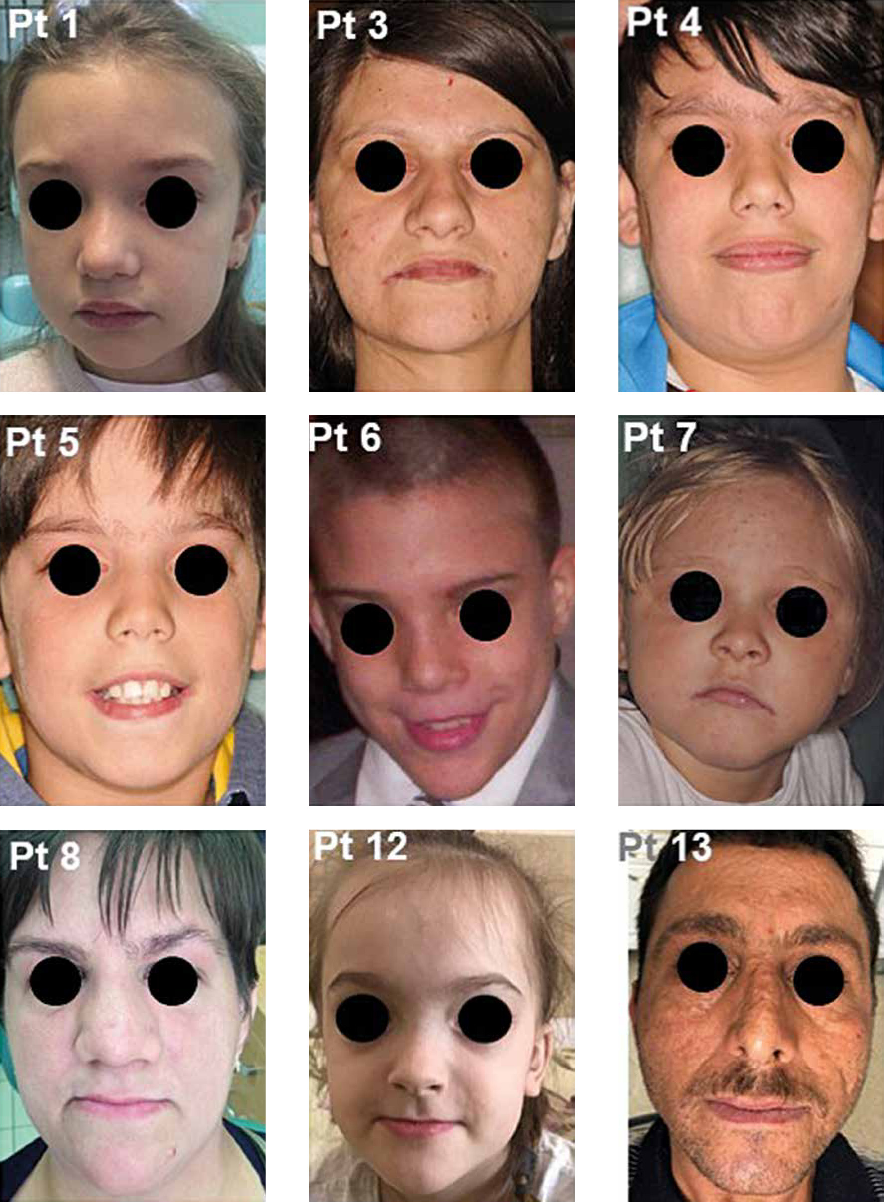 Facial appearance of patients. All patients above the age of 7 had shown at least partial facial features of AD-HIES. Facial features include coarse face, rough facial skin, prominent forehead, deep-set eyes, increased inter-alar distances, and wide fleshy nasal tip. Of the 14 patients, 9 contributed to having photo documentation