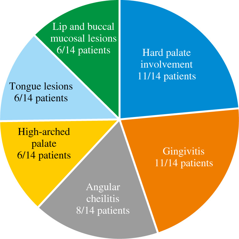 Intraoral abnormalities are summarized in Table 2 and shown in Figs. 2 and 3. Most of the patients (11/14, 78%) exhibited at least one oral lesion. Three patients (2 adults, 1 child) did not exhibit any lesions of the oral mucosa. Two of these patients had skin involvement and angular cheilitis.