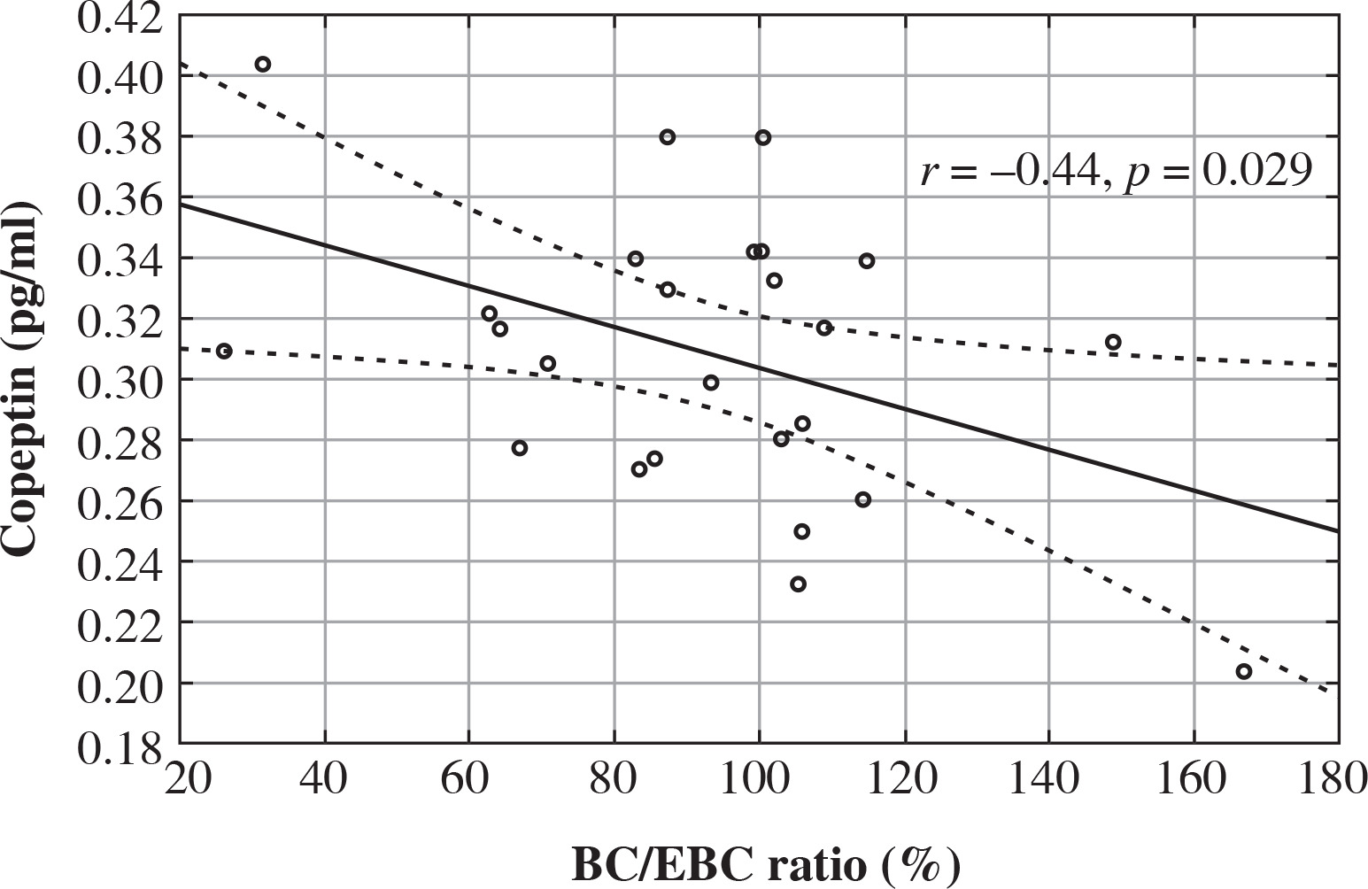 In the study group we found a tendency towards positive correlations between serum copeptin level and age (r = 0.39, p = 0.056), hemoglobin (r = 0.40, p = 0.060). No significant correlations between copeptin and hematocrit (r = 0.28, p = 0.200), GFR (r = 0.22, p = 0.288), serum sodium (r = 0.12, p = 0.563), and potassium levels (r = 0.34, p = 0.090), morning specific urine gravity (r = 0.14, p = 0.525) and specific urine gravity in the water deprivation test (r = 0.05, p = 0.830). Also serum copeptin level did not correlate with frequency of bed-wetting (r = 0.10, p = 0.639). Serum copeptin correlated only negatively with BC/EBC ratio (r = –0.44, r = 0.029) (Fig. 1).