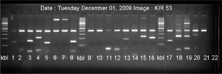 Representative electrophoretogram of KIR genes on an agarose-coated plate. Numbers of stripes correspond to the following genes: 1 – 2DL1, 2 – 2DL2, 3 – 2DL3, 4 – 2DL4, 5 – 2DL5 all, 6 – 2DL5A, 7 – 2DL5B, 8 – 2DS1, 9 – 2DS2, 10 – 2DS3, 11 – 2DS4del, 12 – 2DS4ins, 13 – 2DS5, 14 – 3DL1, 15 – 3DL2, 16 – 3DL3, 17 – 3DS1, 18 – 2DP1, 19 – 3DP1, 20 – DNA contamination control, 21 – positive control (β-actin), 22 – negative control. Interpretation of the result: positive results (number of stripe in parenthesis) – 2DL1 (1), 2DL3 (3), 2DL4 (4), 2DL5all (5), 2DL5A (6), 2DL5B (7), 2DS1 (8), 2DS5 (13), 3DL2 (15), 3DL3 (16), 3DS1 (17), 2DP1 (18), 3DP1 (19). 2D – receptor-encoding genes with two extracellular immunoglobulin- like domains, 3D – receptor-encoding genes with three extracellular immunoglobulin-like domains, L – long transmembrane sequence – inhibitory genes, S – short transmembrane sequence – activating genes, P – pseudogene