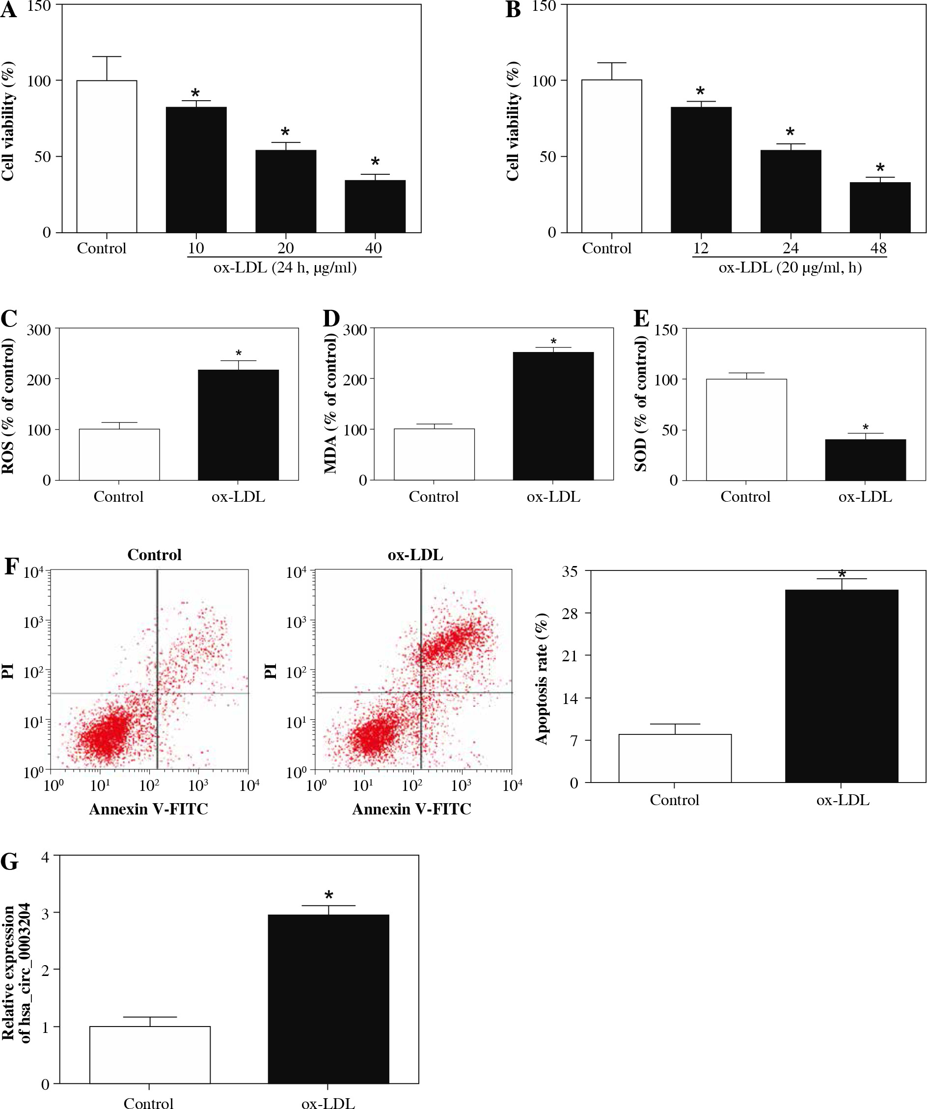 Effect of ox-LDL on expression of hsa_circ_ 0003204 in HAECs. A) CCK-8 assay was conducted to determine the viability of HAECs treated with ox-LDL (10, 20, 40 μg/ml) for 24 h. B) CCK-8 assay was carried out for assessment of the viability of HAECs treated with ox- LDL (20 μg/ml) for 12 h, 24 h, 48 h. C-E) Levels of ROS, MDA and SOD in the supernatant of ox-LDL-induced HAECs were analyzed with the microplate reader. F) Flow cytometry assay was employed to detect apoptosis of ox- LDL-induced HAECs. G) qRT-PCR was applied to assess the expression of hsa_circ_0003204 in ox-LDL-induced HAECs. Data are shown as mean ± standard deviation of 3 independent experiments. *p < 0.05