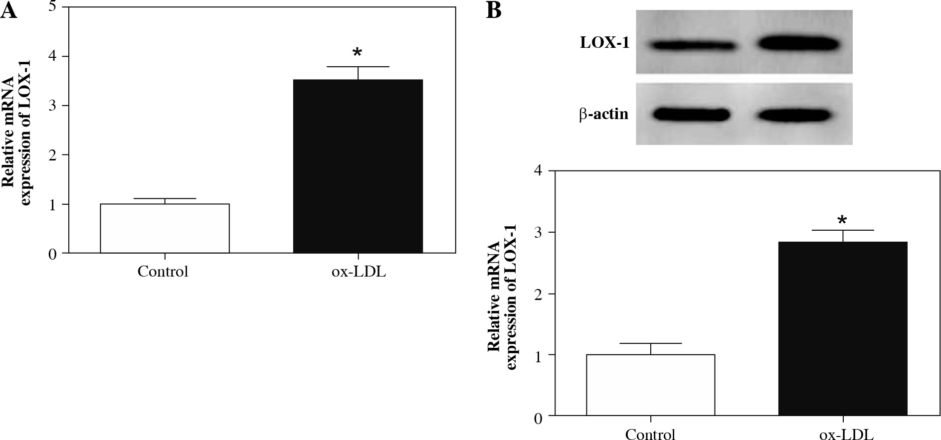 HAECs were cultured in RPMI 1640 medium with different concentrations of ox-LDL (10, 20, 40 µg/ml) for 24 h in order to evaluate the effect of ox-LDL on the viability of HAECs. Also, HAECs were cultured in RPMI 1640 medium with ox-LDL (20 µg/ml) for 24 h, 48 h, and 72 h to assess the effect of ox-LDL on HAEC viability. HAECs with ox-LDL (20 µg/ml) treatment for 48 h were used as an AS cell model for further studies.