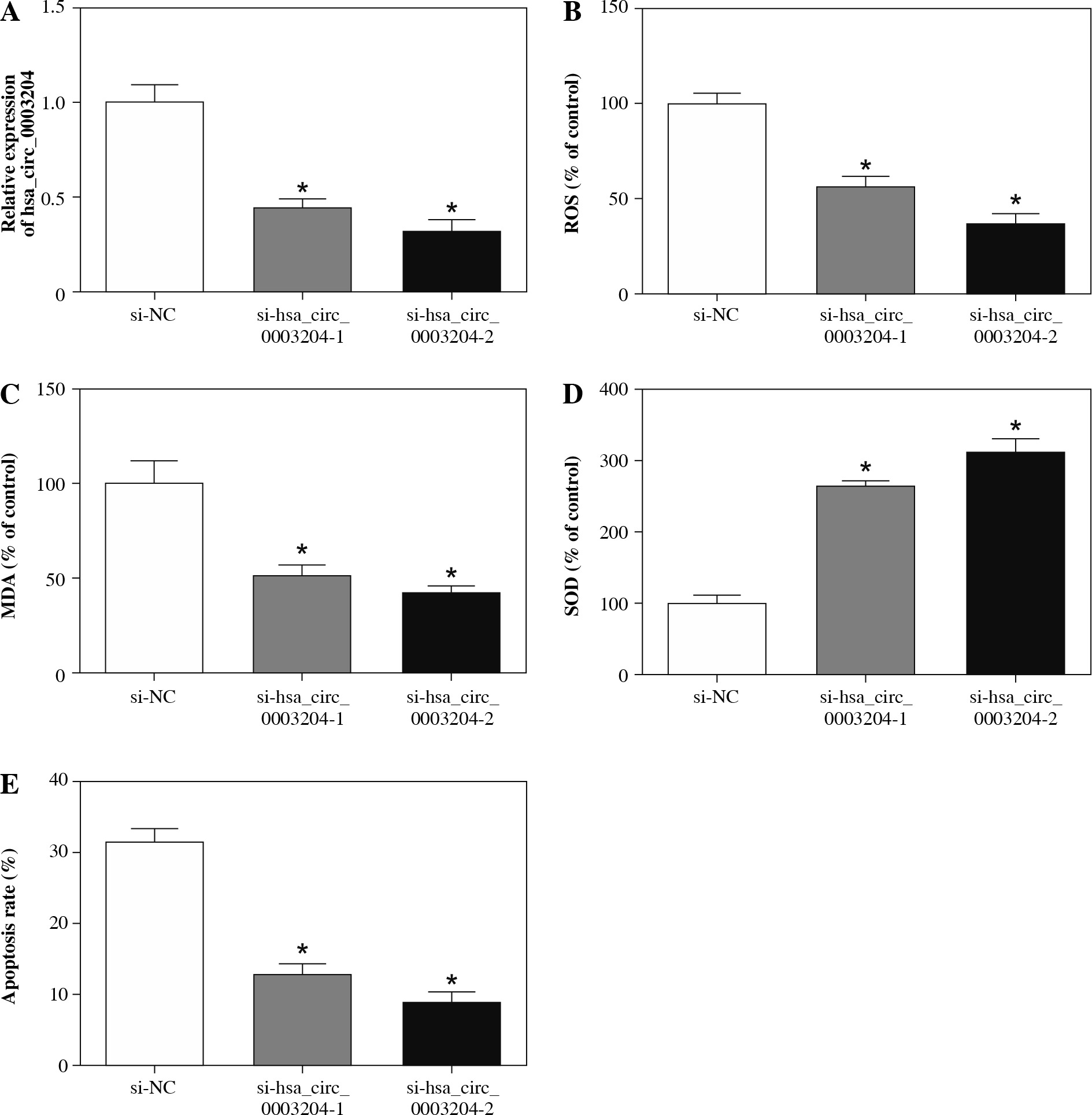 Effects of hsa_circ_0003204 on oxidative stress and apoptosis of ox-LDL-induced HAECs. A-E) HAECs treated with ox-LDL were transfected with si-NC, si-hsa_ circ_0003204-1 or si-hsa_circ_0003204-2. A) Expression of hsa_circ_0003204 in HAECs treated with ox-LDL was analyzed by qRT-PCR. B-D) Levels of ROS, MDA and SOD in supernatant of HAECs treated with ox-LDL were evaluated through the microplate reader. E) Apoptosis rate of HAECs treated with ox-LDL was analyzed via flow cytometry assay. Data are shown as mean ± standard deviation of 3 independent experiments. *p < 0.05