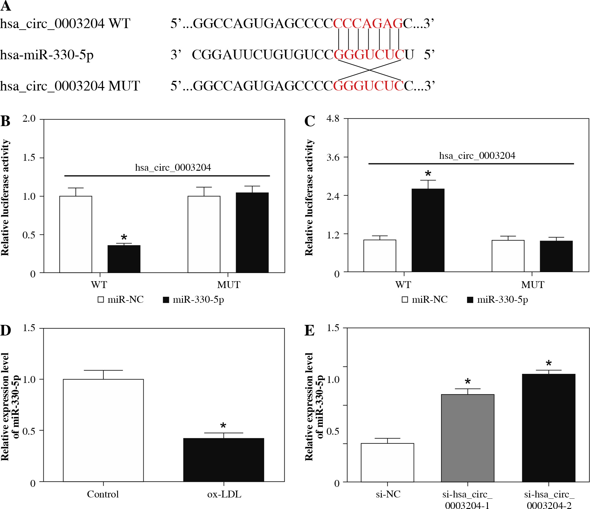 MiR-330-5p was a target of hsa_circ_0003204 in HAECs. A) Binding sites between miR-330-5p and hsa_ circ_0003204 were predicted by the CircInteractome database. B, C) Activities of luciferase reporter vectors (hsa_ circ_0003204 WT and hsa_circ_0003204 MUT) in HAECs transfected with miR-NC (B), miR-330-5p (B), in-miR-NC, (C) or in-miR-330-5p (C) were evaluated with dual-luciferase reporter assay. D) Expression of miR-330-5p in ox-LDLinduced HAECs was detected by qRT-PCR. E) Level of miR-330-5p in ox-LDL-induced HAECs transfected with si- NC, si-hsa_circ_0003204-1, or si-hsa_circ_0003204-2 was analyzed via qRT-PCR. Data are shown as mean ± standard deviation of 3 independent experiments. *p < 0.05