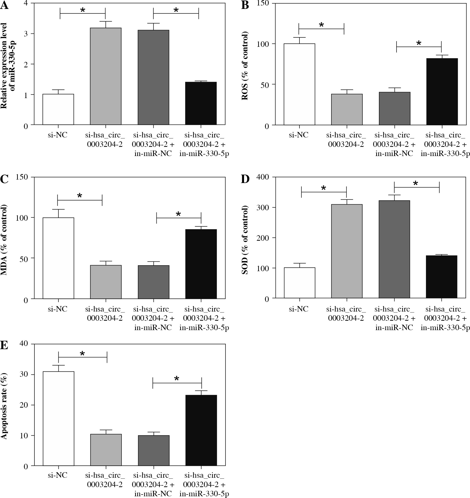 Hsa_circ_0003204 worked via regulating miR-330-5p expression in ox-LDL-induced HAECs. A-E) Ox-LDL-induced HAECs were transfected with si-NC, si-hsa_circ_0003204-2, si-hsa_circ_0003204-2 + in-miR-NC or si-hsa_circ_0003204-2 + in-miR-330-5p. A) Expression of miR-330-5p was analyzed through qRT-PCR. B-D) The microplate reader was used to analyze the levels of ROS, MDA, and SOD in supernatant of ox-LDL-induced HAECs. E) Flow cytometry assay was applied to detect the apoptosis rate of ox-LDL-induced HAECs. Data are shown as mean ± standard deviation of 3 independent experiments. *p < 0.05