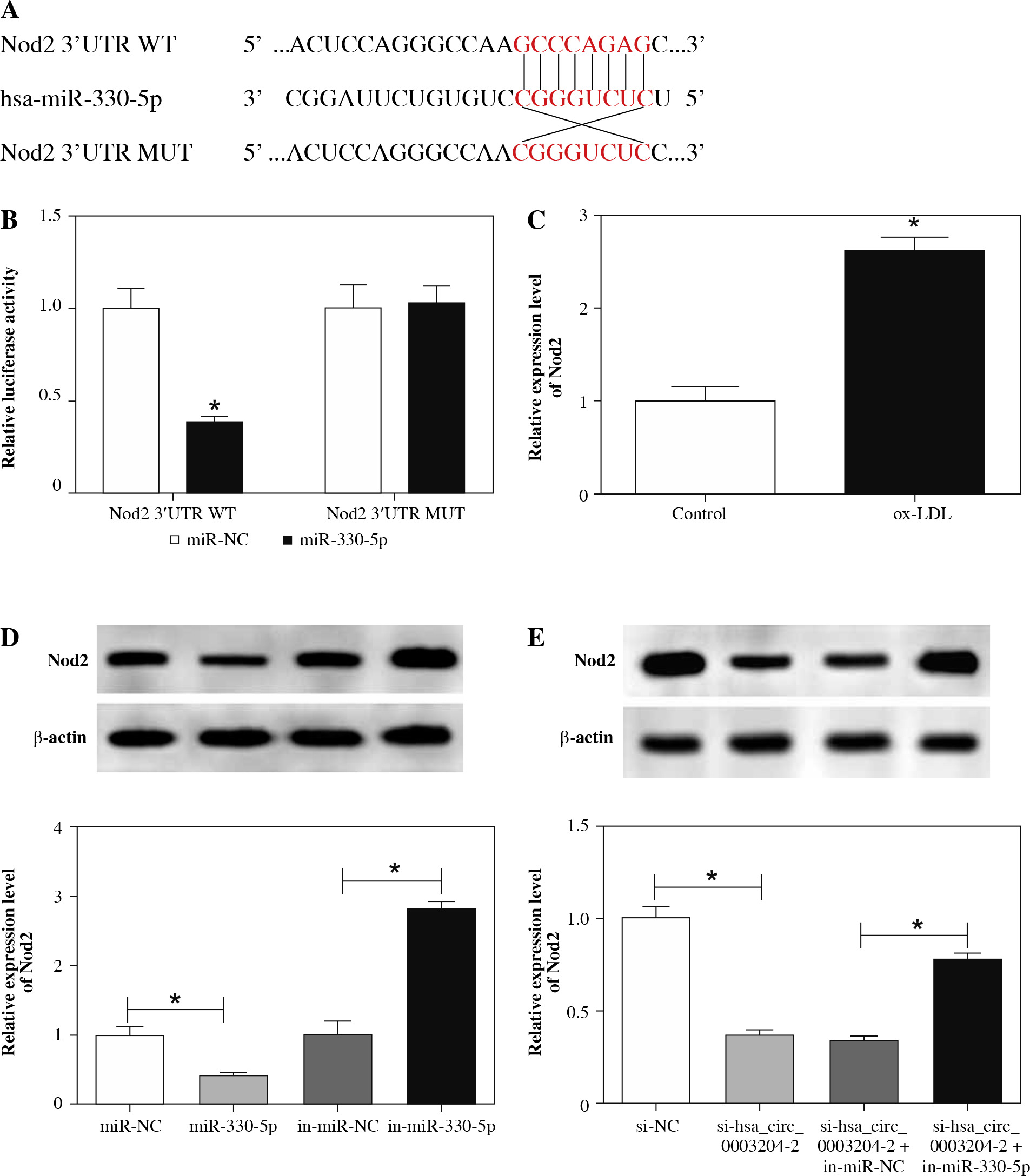 MiR-330-5p targeted Nod2 in HAECs. A) Binding sites of miR-330-5p in Nod2 were predicted by the DIANA microT-CDS database. B) Luciferase activities of Nod2 3'UTR WT and Nod2 3'UTR MUT in HAECs transfected with miR-330-5p or miR-NC were assessed by dual-luciferase reporter assay. C) mRNA level of Nod2 in ox-LDL-induced HAECs was measured through qRT-PCR. D) Protein level of Nod2 in ox-LDL-induced HAECs transfected with miR-NC, miR-330-5p, in-miR-NC, or in-miR-330-5p was evaluated using western blot analysis. E) Western blot analysis was carried out for evaluation of the protein level of Nod2 in ox-LDL-induced HAECs transfected with si-NC, sihsa_ circ_0003204-2, si-hsa_circ_0003204-2 + in-miR-NC, or si-hsa_circ_0003204-2 + in-miR-330-5p. Data are shown as mean ± standard deviation of 3 independent experiments. *p < 0.05