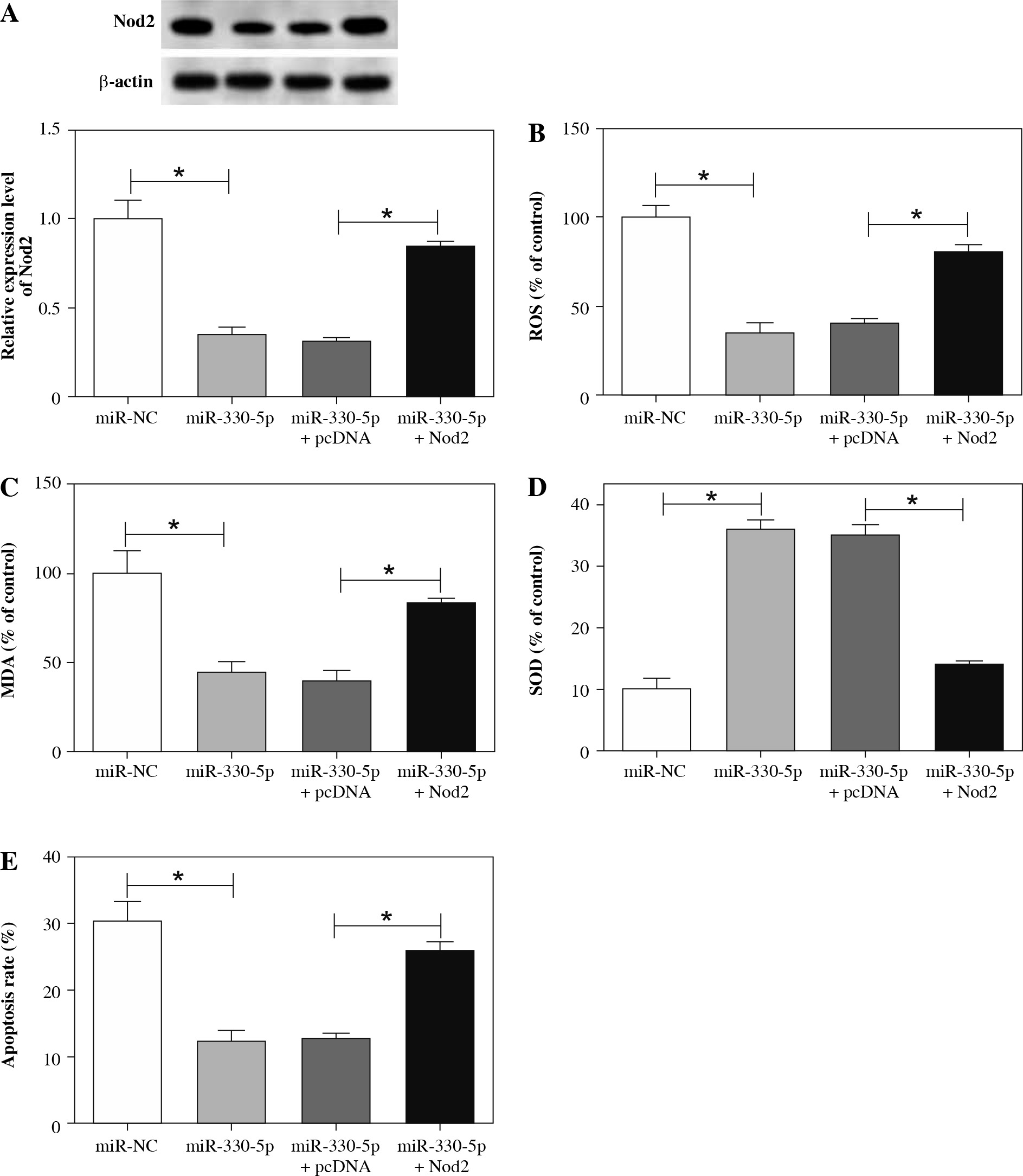 Knowing that miR-330-5p negatively regulated Nod2 expression, we next investigated whether miR-330-5p mediated the oxidative stress and apoptosis of ox-LDL-induced HAECs via Nod2. Firstly, the protein level of Nod2 in ox-LDL-induced HAECs transfected with miR-NC, miR-330-5p, miR-330-5p + pcDNA, or miR-330-5p + Nod2 was assessed with western blot analysis. The results indicated that the inhibition of Nod2 protein mediated by miR-330-5p upregulation was restored by the overexpression of Nod2 (Fig. 7A). Furthermore, we found that both the constraint of ROS and MDA and the acceleration of SOD in the supernatant of ox-LDL-induced HAECs prompted by miR-330-5p elevation were recovered by Nod2 upregulation (Fig. 7B-D). Moreover, Nod2 enhancement overturned the inhibition of apoptosis of ox-LDL-induced HAECs earned by miR-330-5p elevation (Fig. 7E). Together, these data indicated that miR-330-5p modulated cell oxidative stress and apoptosis in ox-LDL-induced HAECs by Nod2.