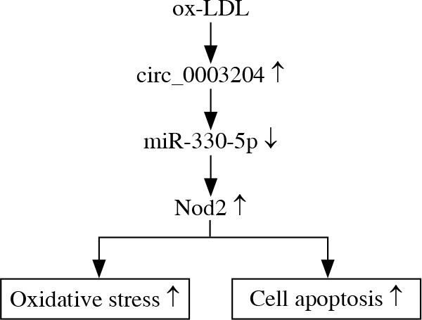 It was reported that Nod2 could increase lipid-rich necrotic core expression and contribute to vascular inflammation in AS [31]. Moreover, AS was associated with Nod2-mediated increase in innate immunity [16]. The report of Xu et al. revealed that Nod2 downregulation could mitigate endothelial cell injury induced by ox-LDL [19]. Also, the reduction of Nod2 caused by long noncoding RNA XIST inhibition could attenuate endothelial cell injury by repressing apoptosis and promoting the viability of ox-LDL-induced umbilical vein endothelial cells [20]. In this study, we discovered that Nod2 was enhanced in ox-LDL-induced HAECs and Nod2 was the target of miR-330-5p. Moreover, the introduction of Nod2 abolished miR-330-5 upregulation-mediated oxidative stress and apoptosis of ox-LDL-induced HAECs. In addition, hsa_circ_0003204 regulated Nod2 protein via miR-330-5p in HAECs. Therefore, we verified that Nod2 could accelerate the process of AS, in line with the previous studies. Therefore, we concluded that ox-LDL-induced hsa_circ_0003204 regulated endothelial cell injury through the miR-330-5p/Nod2 axis (Fig. 8).